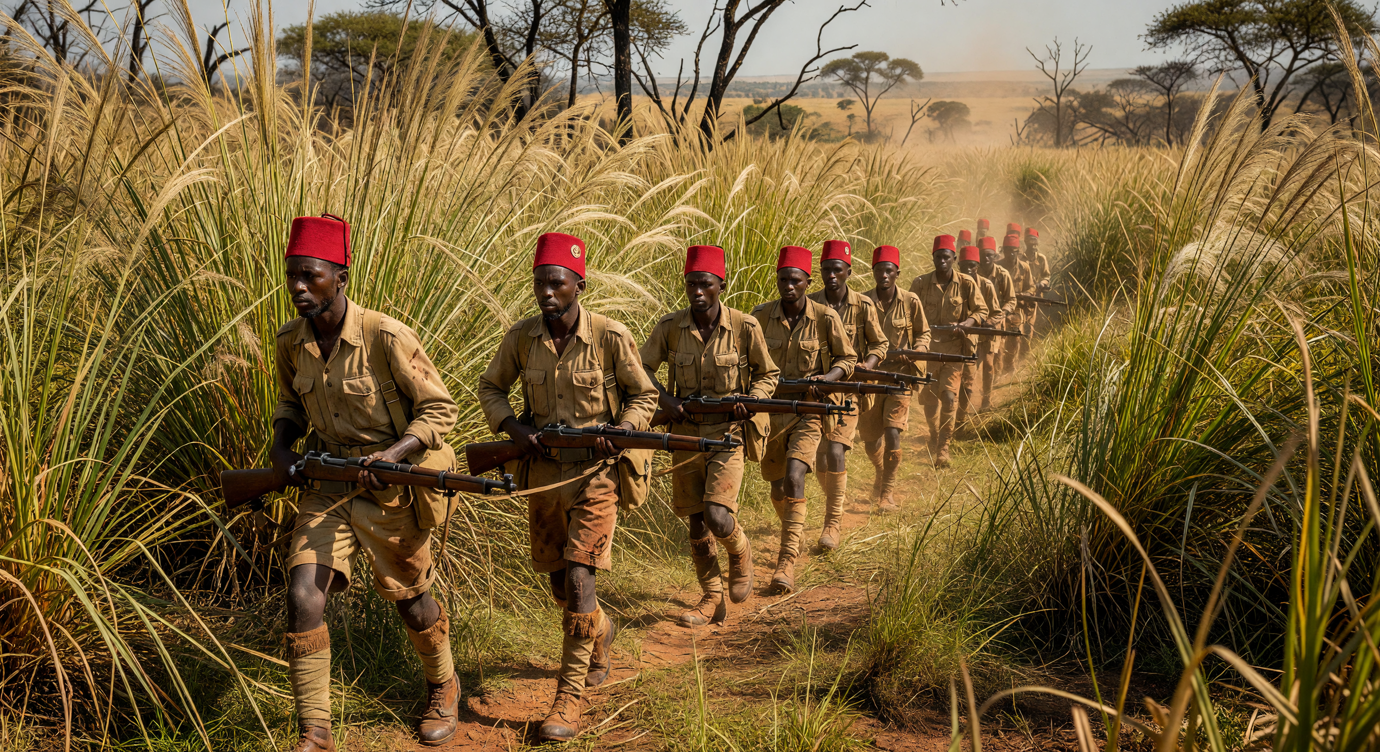 Paragraph 1: The committee broadly agrees the scene is recognizable as a WWI-era East African colonial patrol: khaki tropical dress, red fez-style headgear, bolt-action Lee-Enfield/SMLE-type rifles, and a savanna/elephant-grass setting all fit the intended period and region at a high level. Several reviewers also found the tall grass, dusty track, and overall patrol composition plausible for the East African campaign.