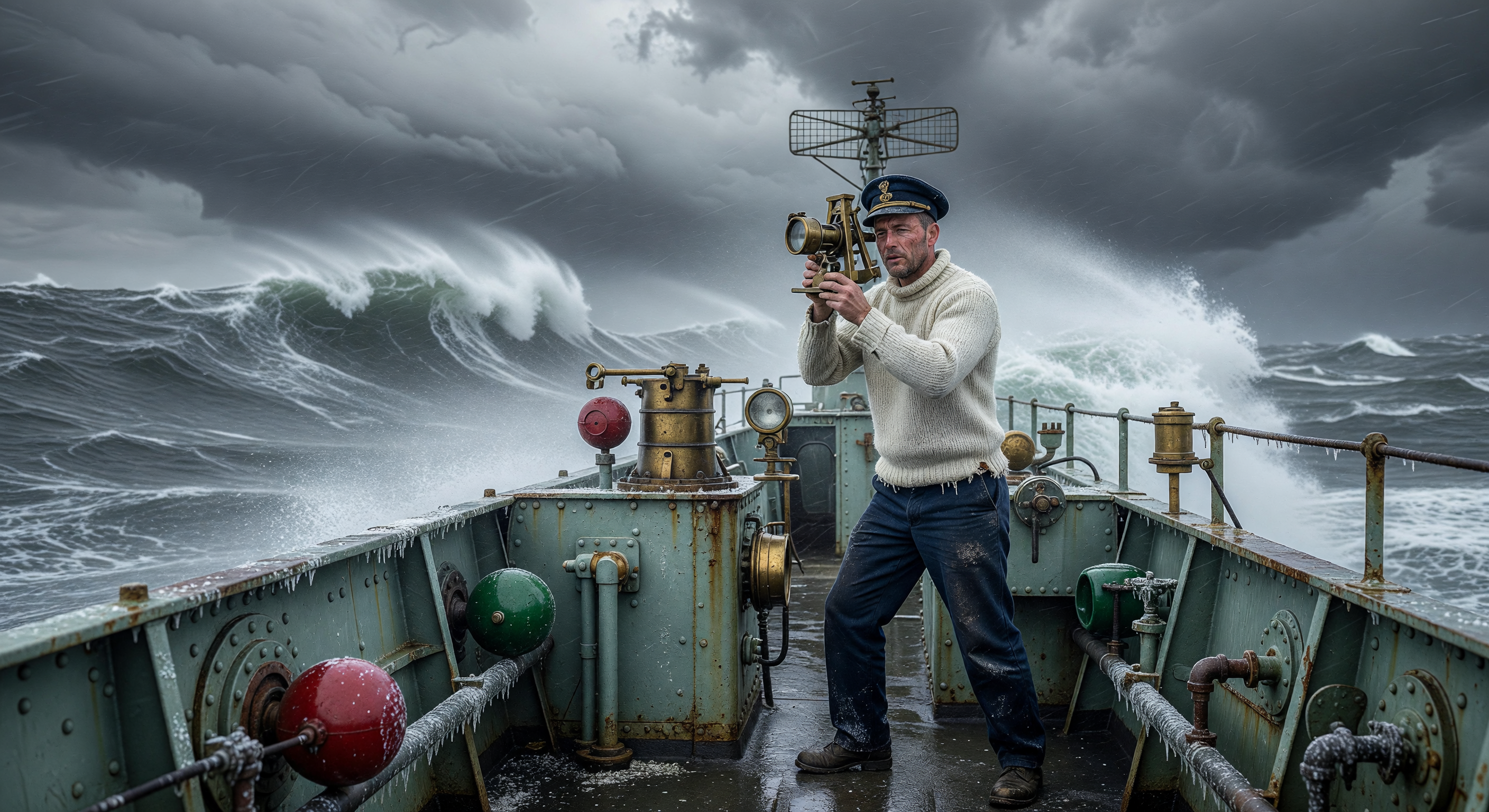 - 한국어: 폭풍 속 구축함 함교에서 육분의를 사용하는 항해사