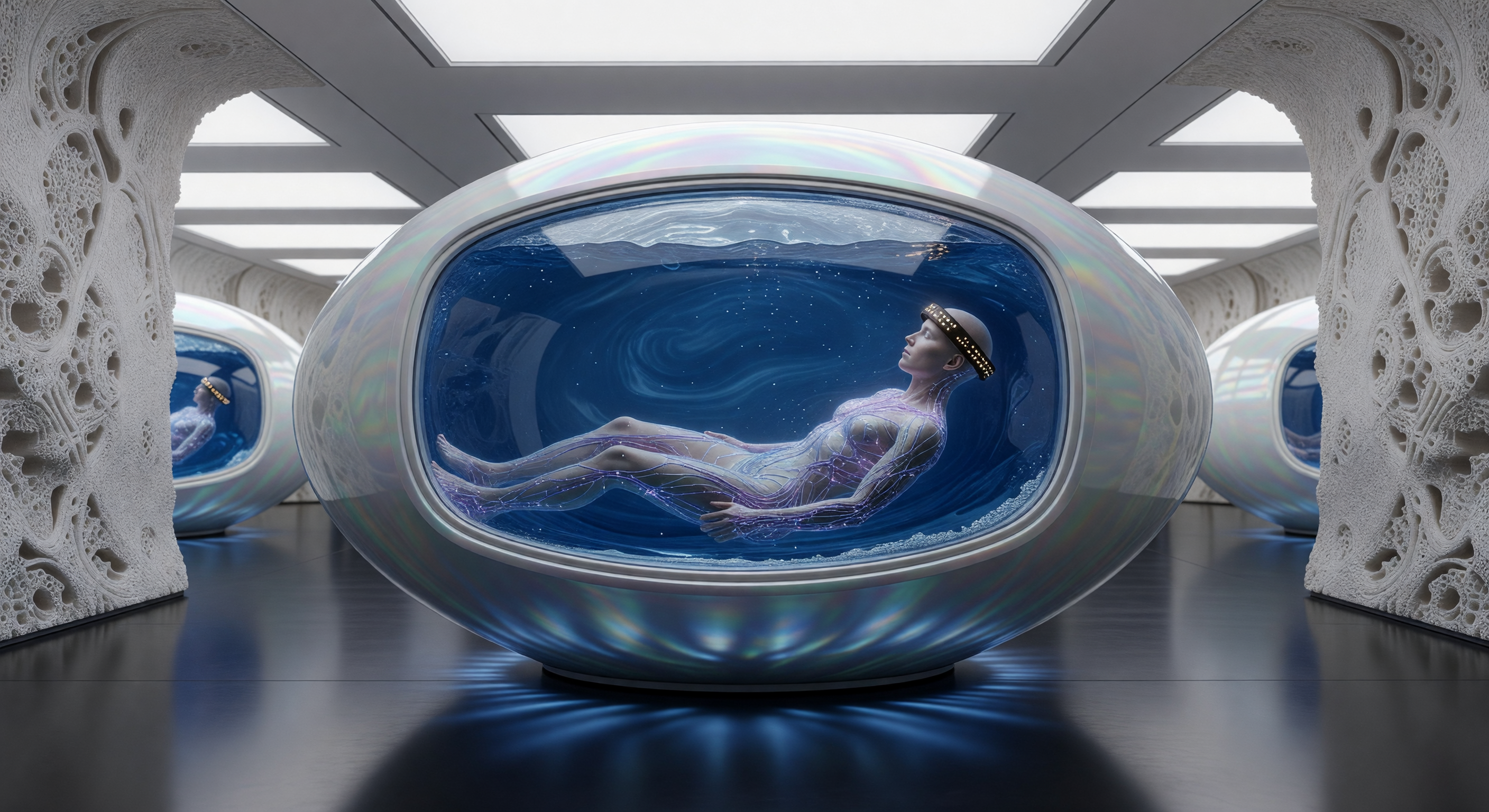 22世紀後半の「コンバージェンス(融合期)」、チューリッヒの施設に並ぶ卵型の「クロノス・ヴァット」は、生物と機械が不可分となった時代の象徴です。深青色の酸素化フッ化炭素に満たされた槽内では、銀紫色の「シナプティック・ウィーブ(神経織網)」を皮膚下に宿した被験者が、テクノロジーによる半永久的な進化の過程として深い休眠状態にあります。背後の壁面はかつての大気中二酸化炭素を固定化した炭酸カルシウムで構築されており、生命、デジタル、そして地球の地質学的プロセスが完全に統合されたこの時代の特異性を物語っています。