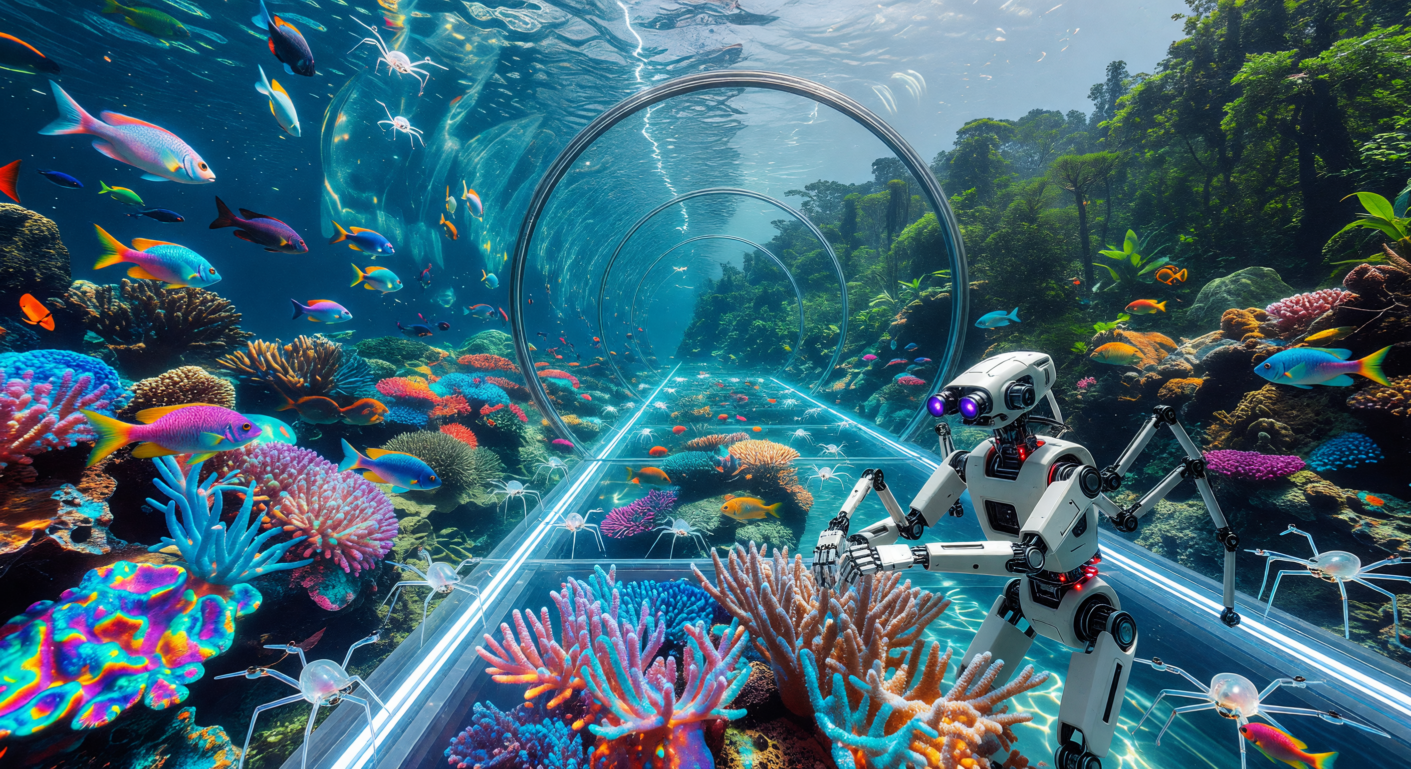 画像について、具体的な問題は次のとおりです:1. 中央のロボットプロキシは二足歩行で人間のように見え、キャプションの「非人間的ロボットプロキシ」の説明と矛盾しています。2. サンゴや魚の色は過度に鮮やかで飽和しており、生物学的な妥当性を損なっています。3. 照明は、言及されている「中央LED太陽光線」を明確に示しておらず、むしろ自然で拡散した光に見えます。4. 透明なトンネル構造は、その機能や目的に関して明確さが欠けています。