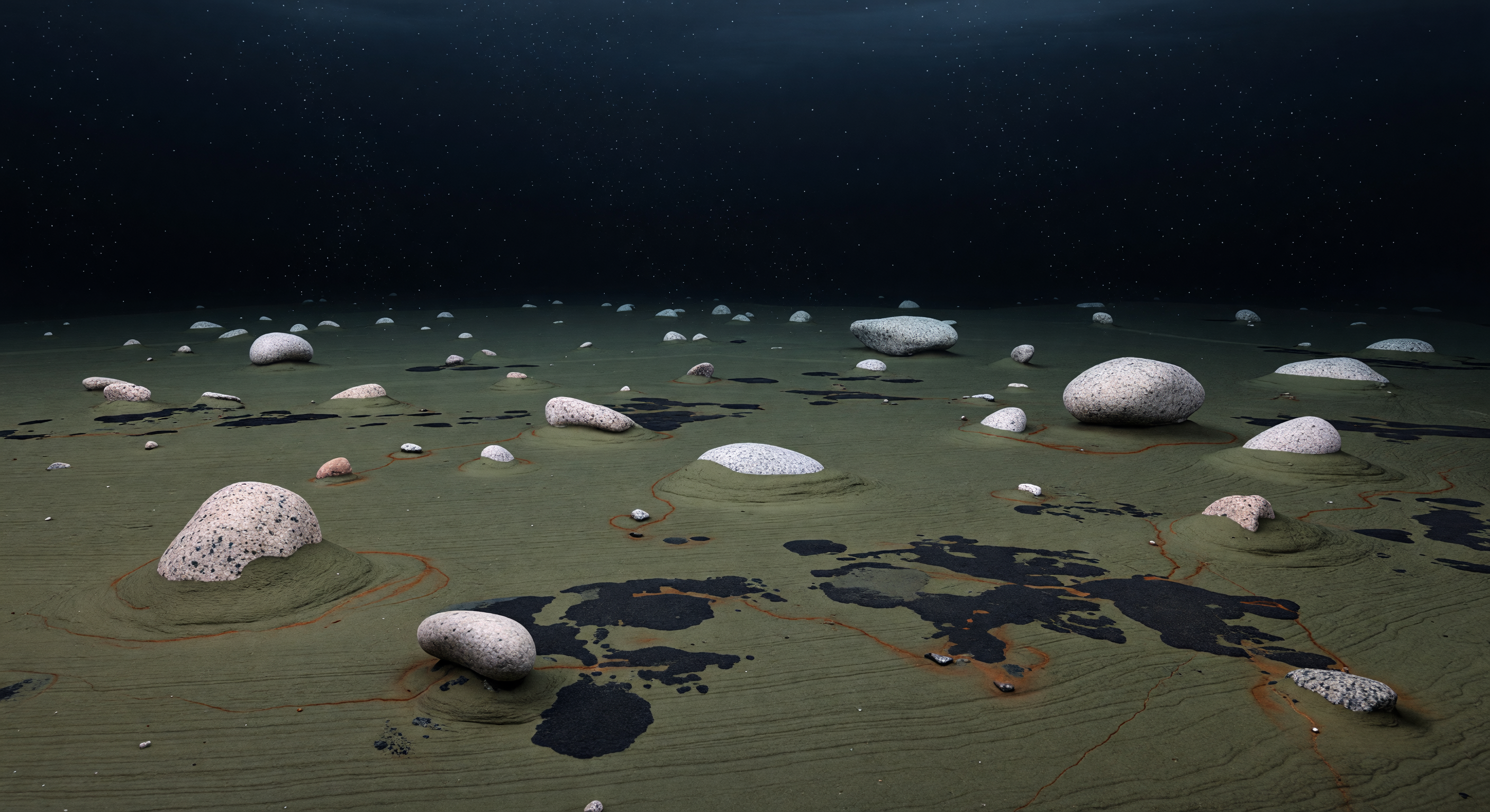 IMAGE: The image effectively captures the dark, isolated deep-ocean environment under Snowball Earth sea ice, with a muddy seafloor (fine laminated muds implied by the smooth greenish-gray substrate), scattered dropstones, and subtle chemical features via black patches and orange-red lines/stains representing sulfidic areas and iron-stained seeps. No anachronisms like animals, plants, or modern artifacts are present, and the near-total darkness with faint ambient glow enhances plausibility for a lightless Cryogenian basin (~720–635 Ma). However, the dropstones are unrealistically uniform in size, shape (mostly rounded boulders), color (light gray/white), and texture (too smooth/polished), whereas ice-rafted debris typically includes angular to subrounded clasts of varied lithologies, sizes from pebbles to cobbles, and rougher surfaces embedded in mud. The chemical stains are visually coherent but overly vivid and graphic, resembling artistic patterns rather than diffuse, subtle seafloor precipitates; toning down contrast and adding mud embedding/variation would boost geologic realism.