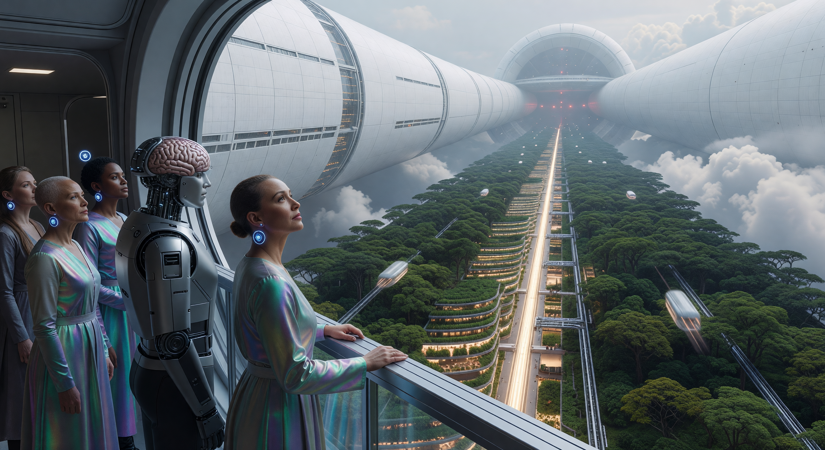 IMAGE: The image excellently captures the essence of an O'Neill cylinder interior during a speculative 26th-century Solar Expansion era. The upward-curving horizon, central axial light trench lined with dense green forests and terraced structures, receding cylindrical geometry, internal clouds, and transport pods are all visually coherent and scientifically plausible for a large-scale rotating habitat (e.g., Island Three designs with ~3-6 km diameters support .9g spin gravity and atmospheric depth for clouds). The iridescent, flowing garments on the human figures suggest advanced textiles suitable for a controlled environment, and subtle tech like glowing earpieces add futurism without anachronism. The diverse group gazing outward fits a multi-type resident scene. However, the 'Synth' figure's fully exposed biological brain is a significant scientific implausibility—even in 250 AD, interstellar transit demands radiation shielding, pressure seals, and contamination barriers for neural tissue; this bio-exposure contradicts closed-loop ecology principles. The light source appears as a bright linear track rather than a distinct plasma filament, a minor visual gap. These warrant prompt adjustments (e.g., enclose the brain in a transparent protective module, refine light rendering) rather than full regeneration.