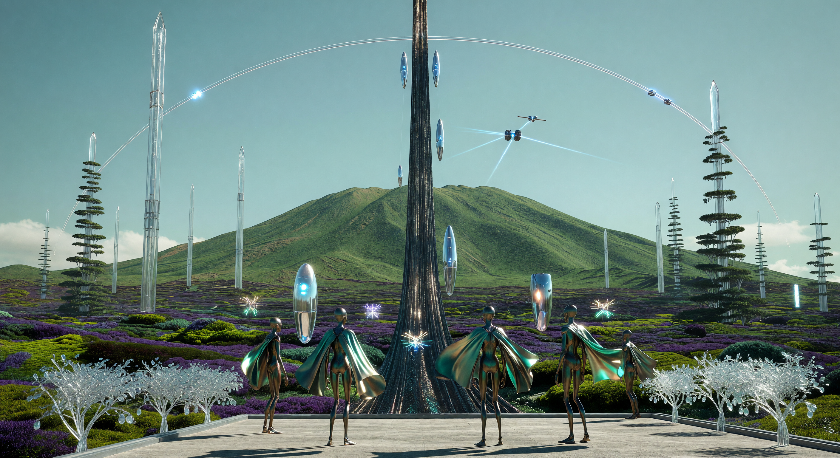Paragraph 1: The committee agrees the image successfully communicates a speculative terraformed Mars/Green World: the beanstalk-like central tower, the arcing sky infrastructure, the purple groundcover, the translucent flora, and the elongated humanoids all support the intended high-future Solar Expansion aesthetic. The scene is internally coherent and visually strong, and several reviewers accepted the broad concept of engineered biomes and advanced orbital/planetary infrastructure.