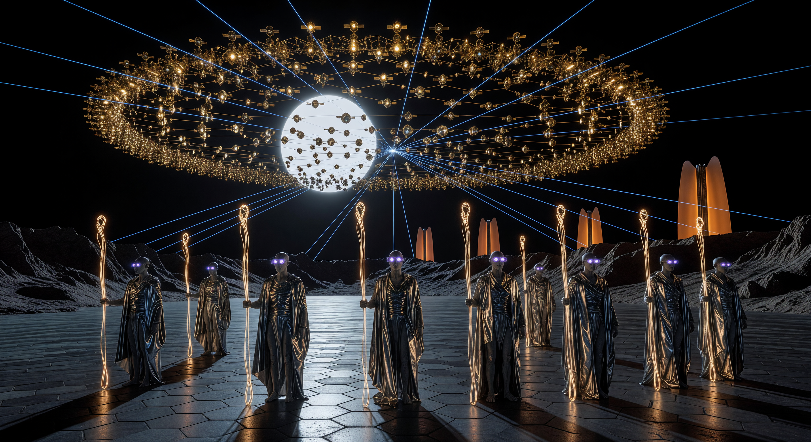 The image effectively captures a speculative far-future aesthetic for Mercury's North Pole in 275 CE, with an airless black sky, polished hexagonal basalt plaza, and robed Lithomorph figures wielding glowing optical-fiber staves in a ritual formation—visually coherent and plausible for augmented humans in a high-tech ceremony. The Dyson Swarm is rendered as a stunning golden lattice encircling a bright central Sun, which works as artistic shorthand for orbital solar collectors, though its low-hanging canopy-like proximity to the surface is unrealistic (a true swarm orbits the Sun at ~1 AU, not hovering over Mercury). Lighting from the Sun and staves creates dramatic glows without atmospheric scattering, a plus for scientific plausibility. However, snowy/mountainous terrain in the background introduces an anachronism—Mercury's poles have water ice only in permanently shadowed craters, not exposed frost fields or jagged peaks resembling lunar highlands; the surface should be regolith/breccia plains. Tall orange obelisks could imply radiators but are too localized and narrow for planetary-scale structures. Minor adjustments to terrain texture and swarm scale would fix these for approval.