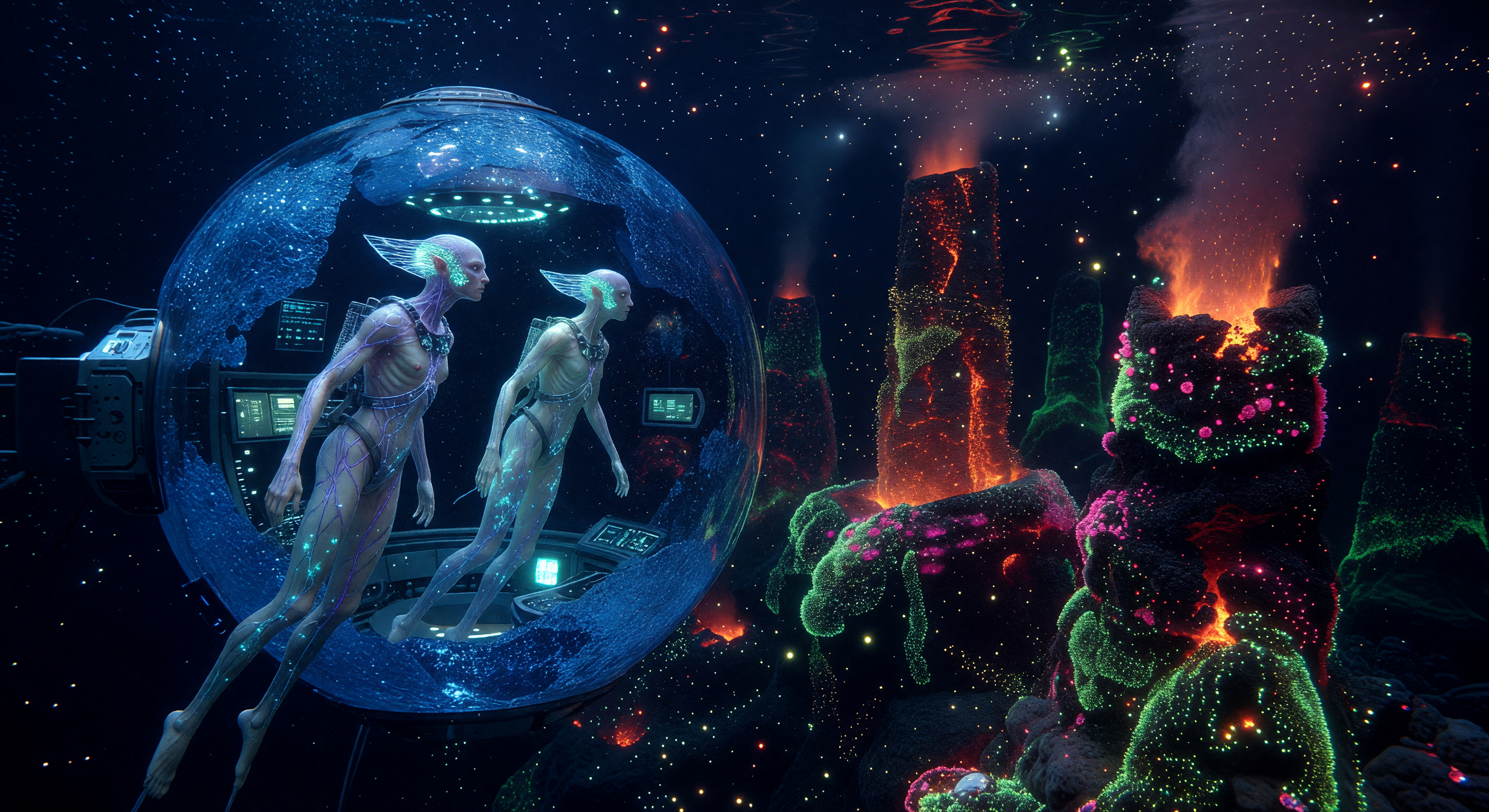 The image depicts two translucent, violet-blooded post-human figures with elongated features and minimal attire inside a transparent, glowing submersible dome, observing neon-glowing microbial clusters around volcanic hydrothermal vent structures emitting red plumes. This captures the speculative bio-engineered explorers and chemosynthetic ecosystem well for a far-future 'Interstellar Dawn' scenario, with visually coherent sci-fi aesthetics. Strengths include the figures' translucent skin and visible violet circulation matching the 'Glacial' diver description, plausible vent morphology with chemical plumes, and bioluminescent 'Glimmer-Microbes' that evoke deep-sea extremophiles. However, the dark starfield background with pinpoint lights undermines the 'lightless sub-glacial abyss' setting, suggesting open space rather than an enclosed ice-overlain ocean; minor adjustments like adding ice ceiling textures, water particulates, or occluded stars would fix this ambiguity. No anachronisms for the futuristic period, and scientific plausibility holds for TRAPPIST-1g's modeled subglacial ocean and hydrothermal vents, though the figures' lack of pressure suits relies heavily on bioengineering, which is acceptable speculation.