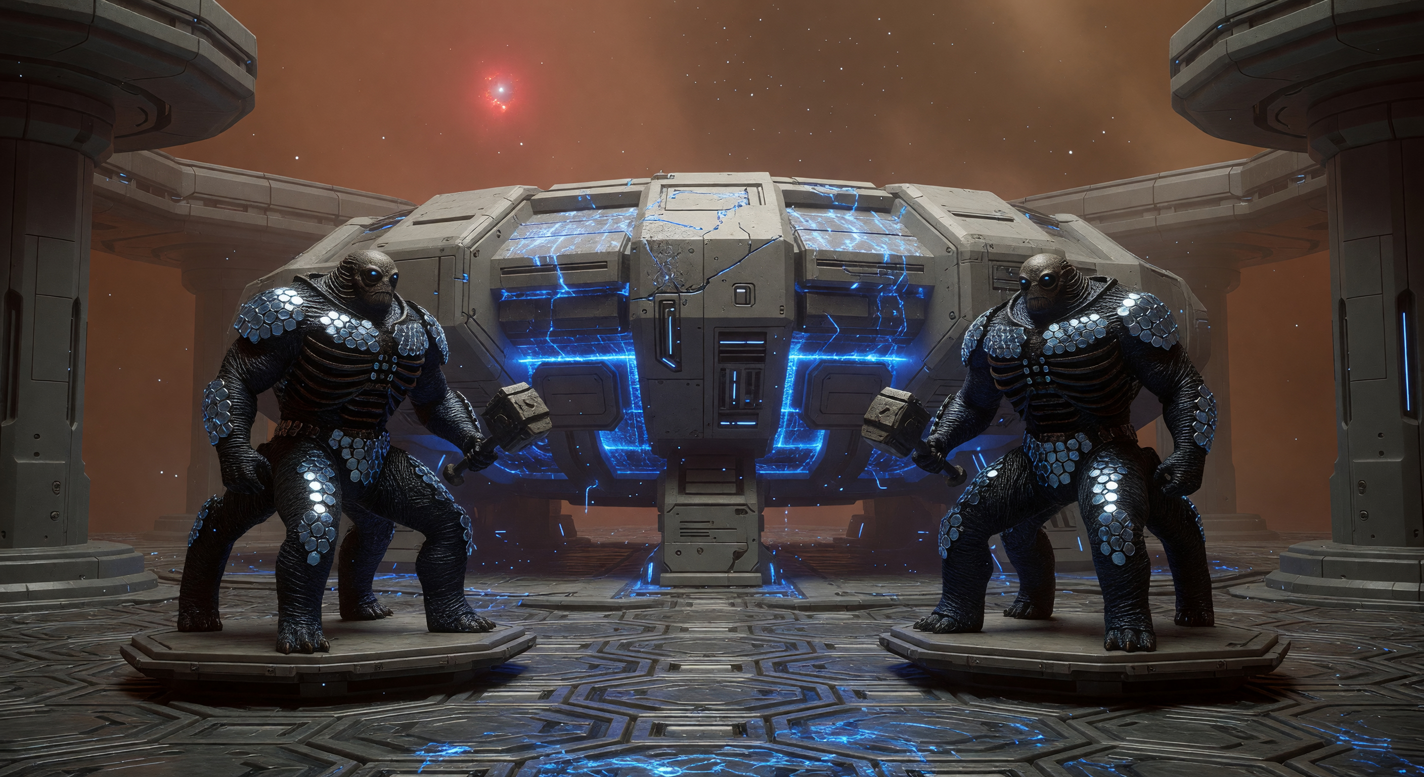 The committee agrees that the image successfully depicts a far-future, high-gravity guardianship scene with two broad, heavily built post-human sentinels, metallic/plated body coverings, heavy maces, and a large blue-glowing reactor core. Multiple reviewers also noted that the reddish-orange sky and visible red stellar object strongly support the caption’s M-dwarf-star context, and that the overall industrial, high-tech architecture coherently matches a Galactic Age setting.