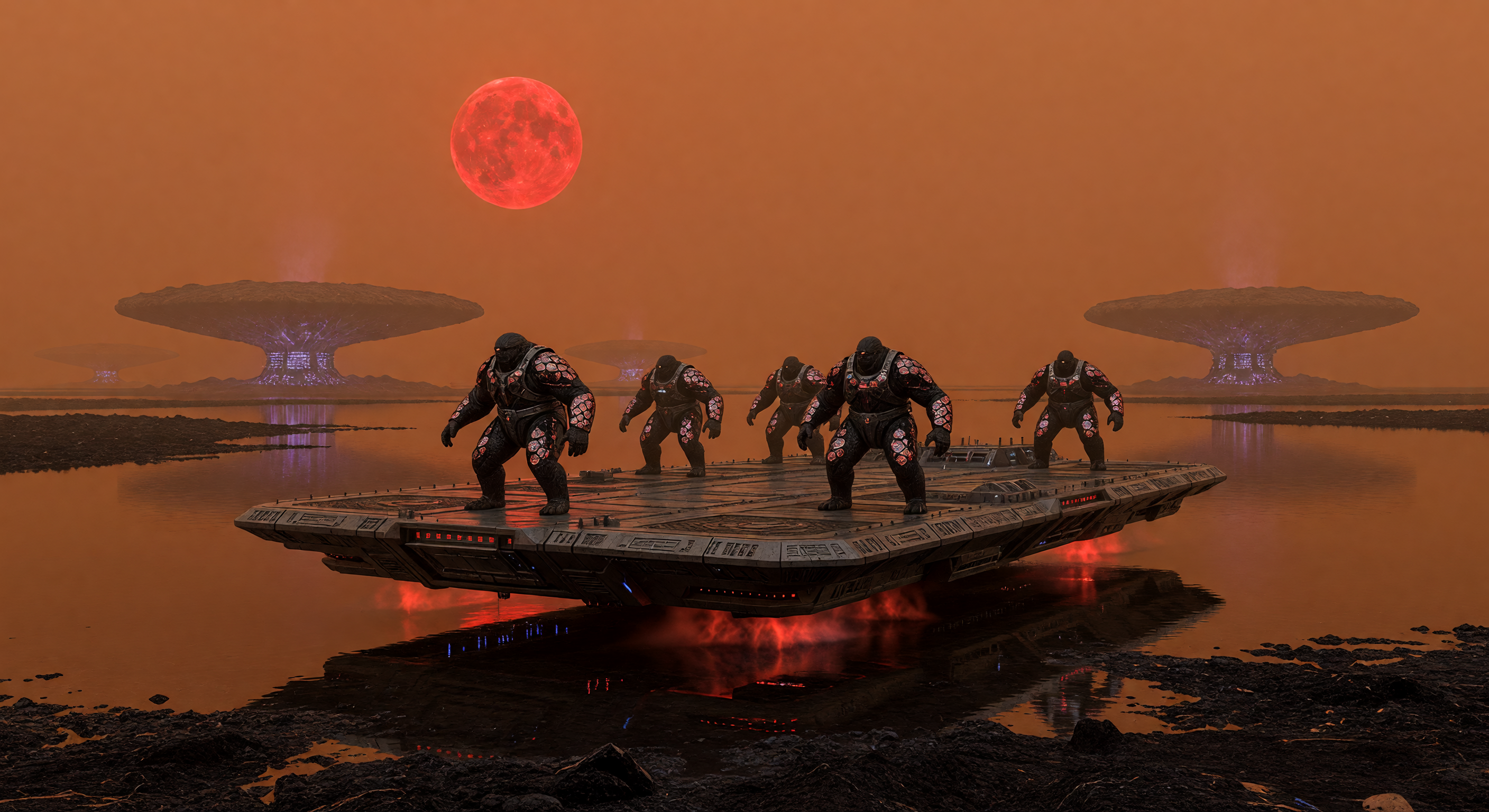 Paragraph 1: The committee agrees the image strongly matches a Galactic Age high-gravity sci-fi scene: the crimson/orange illumination, the massive industrial platform, the reflective water-like surface, and the stocky armored post-humans all support the general setting. The overall mood and mega-engineering aesthetic are coherent and visually compelling.