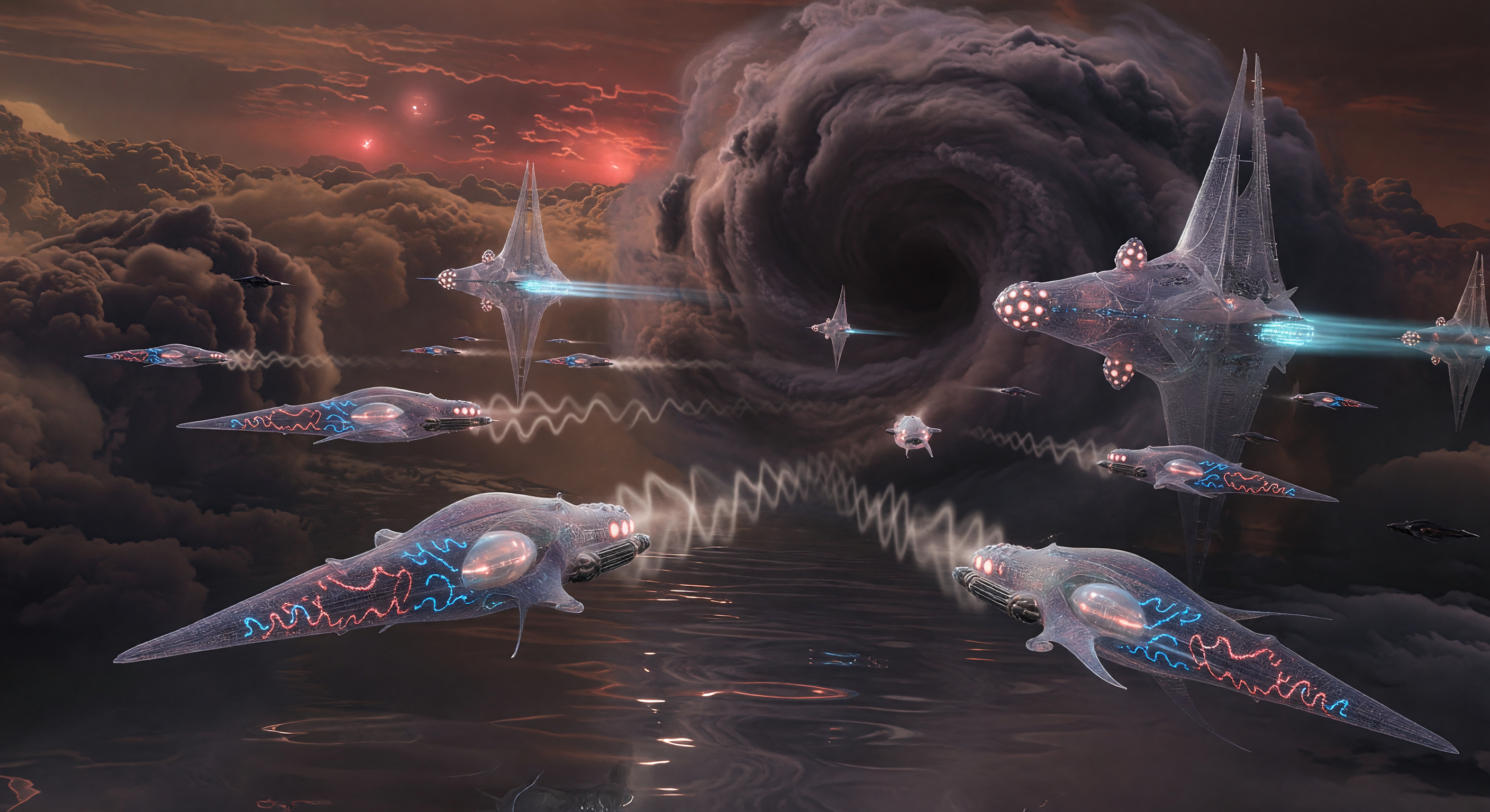 銀河時代(西暦5000年〜20,000年)のガス惑星対流圏にて、極限環境に適応したポスト・ヒューマン「ネビュライト」の分派が、巨大な渦巻く大嵐の境界で衝突する光景です。全長30メートルに及ぶ紡錘形の彼らは、カーボンナノチューブの格子状皮膚と水素嚢を備え、視覚の代わりとなる音響結像ピットを用いて不可視の低周波圧力砲を放ち合います。背景には赤色矮星の淡い光に照らされた浮遊都市「エアロスタット・スパイア」が浮かび、重力よりも流体力学が支配するこの時代の過酷な生存競争と、生命の驚異的な可塑性を物語っています。