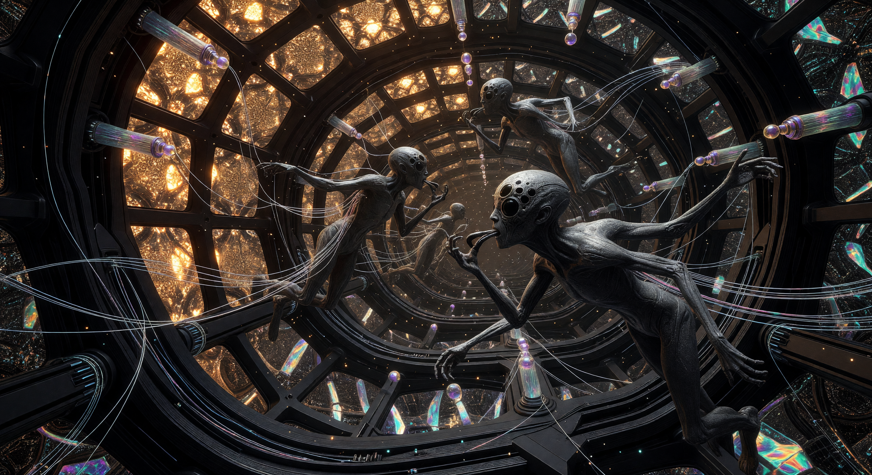 銀河時代(紀元5,000〜20,000年頃)の太陽中心核において、ポスト・ヒューマンの一種「キチン質ボイド・ウォーカー」が無重力のフラクタル空間で休息する様子です。放射線耐性を持つ鉛注入キチン質の外殻と多関節の四肢を備えた彼らは、光ファイバーのテザーから電力を、ナノチューブ供給機から虹色の栄養ペーストを摂取し、過酷な宇宙環境に適応しています。カルダシェフII文明へと到達したこの時代の生命は、ダイソン球殻の強烈な太陽光の下で、生物学と極限工学が融合した独自の進化を遂げています。