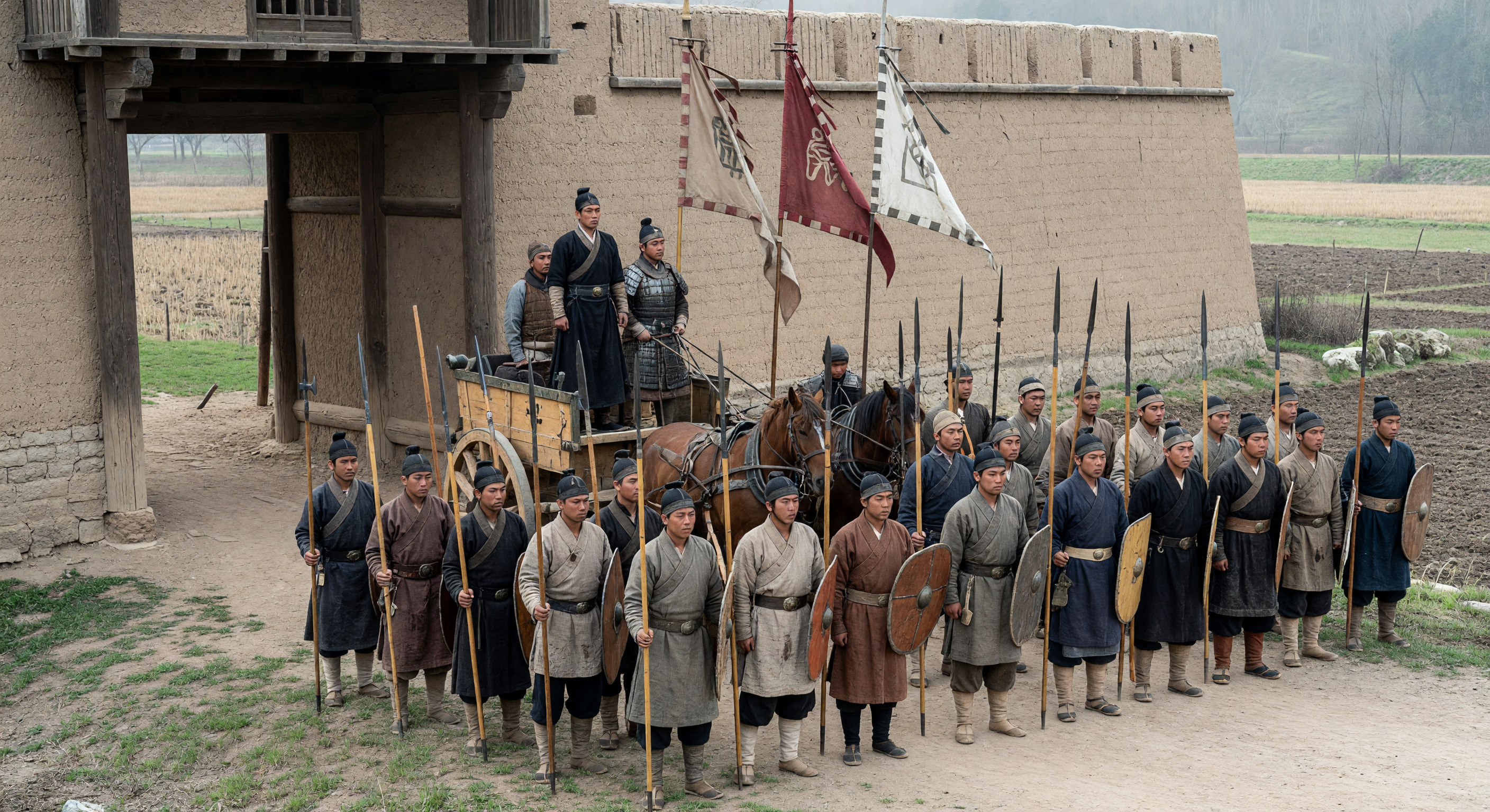 The caption is generally consistent in region and timeframe (late Eastern Zhou/6th century BC north China) and correctly emphasizes the broad shift toward more organized infantry alongside chariots. But it over-asserts specifics that are not clearly supported visually: it claims bronze-tipped spears, ge-dagger-axes, and leather shields, yet the image does not clearly and uniquely show a ge (distinct hook/axe form) or unequivocally bronze tips/leather. “Two-horse chariot” is not clearly identifiable from the current view; the vehicle behind the line could be a chariot, but the exact draft configuration is uncertain. The material/costume claims (“muted hemp and silk garments,” “lacquered fittings,” “6th century BC North China Plain”) are plausible but not evidenced by visible lacquer or clear textile textures, and “rammed-earth fortifications” is the only strongly supported architectural claim.