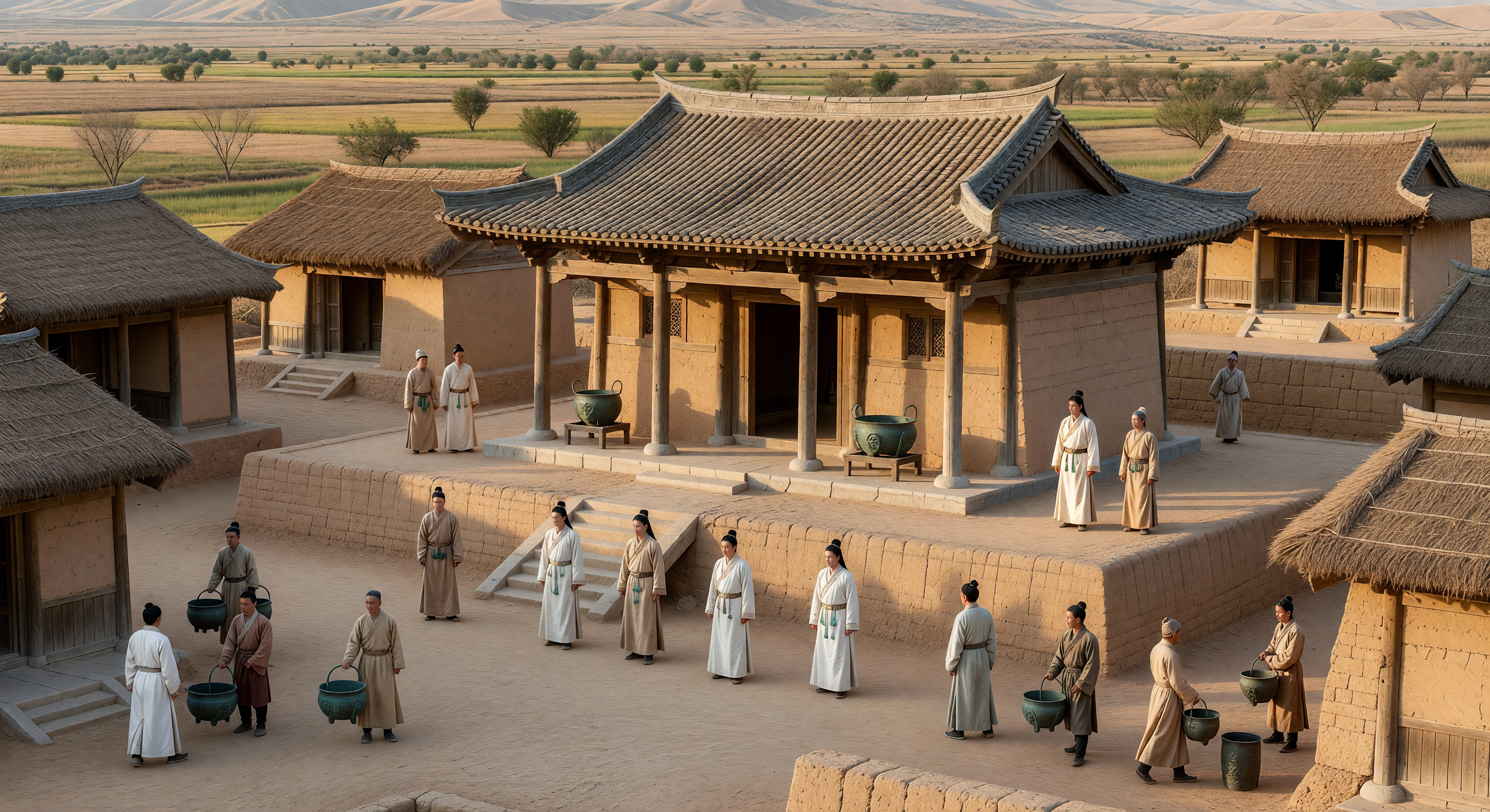 Caption: The caption is largely coherent—Wei River valley, Western Zhou aristocratic compound, ancestral rites, rammed-earth and timber architecture, and bronze ritual ware are broadly consistent with what we expect for early Zhou elite ceremonial life. The main issues are specificity and chronology: it asserts “9th century BC” and “tiled roof reserved for the main shrine.” True tile roofing becomes more archaeologically widespread later (tiles are present earlier in some regions, but “tiled roof reserved for the main shrine” is not securely supported as a general 9th-century Western Zhou norm). Also, it specifies particular vessel types (ding and gui) and very specific dress/jade regalia; these are not verifiably shown with enough clarity in the image to support the claim confidently. Adjusting the caption to be less determinative (e.g., “early Western Zhou/early Zhou,” “ceremonial/ritual bronze vessels,” “roofing tiles or finished roofing”) would better match the evidence visible.