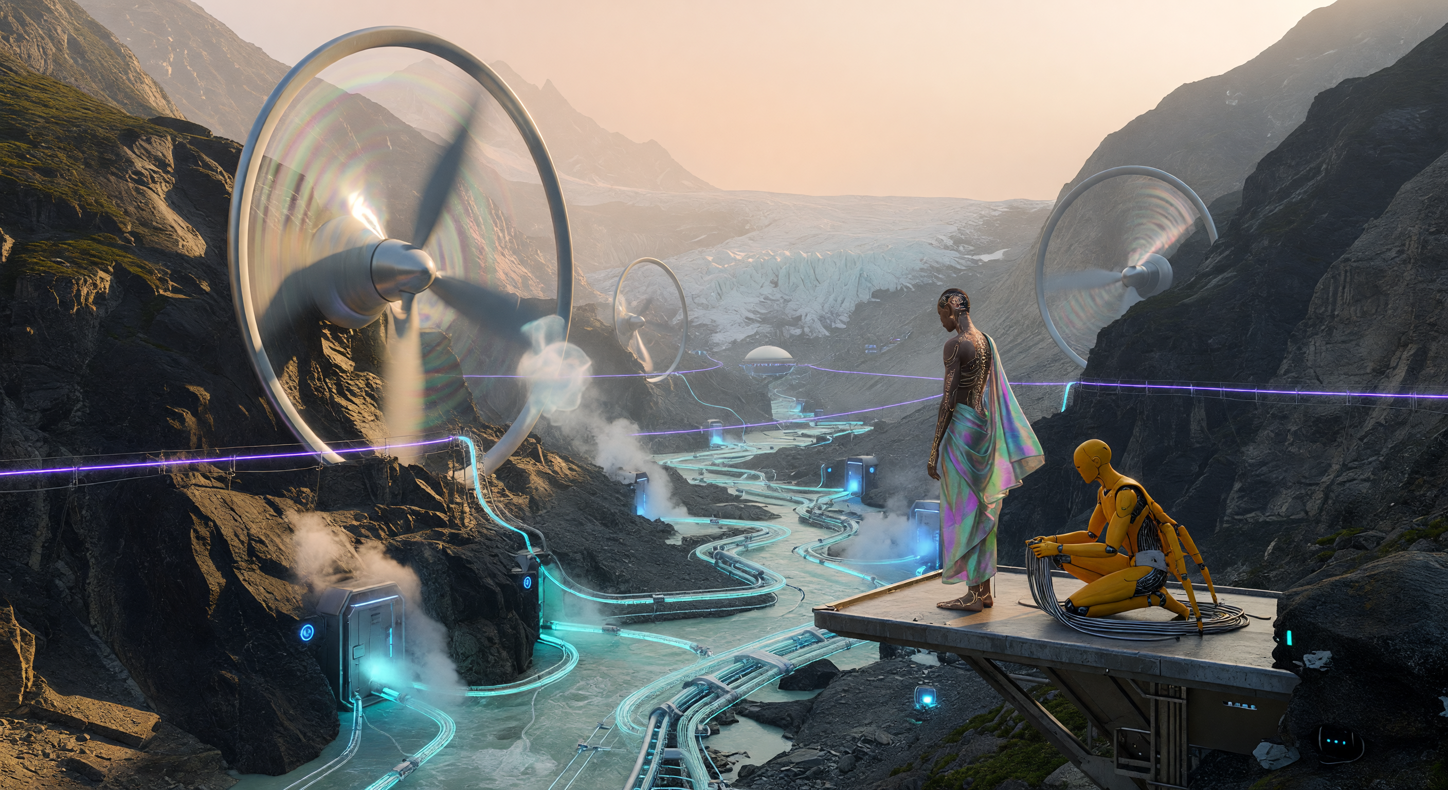The image is visually striking and internally coherent as a speculative 2050 South Asian Himalayan scene. The glacial landscape in the background is plausible for a retreating Khumbu-region glacier, with appropriate high-altitude rocky terrain, a winding meltwater river, and a warm amber/peach sky that could suggest atmospheric particulate interference consistent with climate engineering or pollution. The large circular turbine structures are more reminiscent of wind/air turbines than hydrokinetic meltwater turbines, which is a meaningful disconnect from the caption's 'torrential meltwater' framing — the positioning of these rings in open air above the gorge rather than submerged or channel-integrated makes their purpose ambiguous. The human figure's iridescent draping and visible circuitry/tattooing reads well as a mid-21st century augmented South Asian character. The yellow humanoid robot figure works adequately as a synthetic entity, though 'Yantra' is an invented proper noun not verifiable from visual cues. The glowing teal pipeline network along the riverbed is evocative and plausible for this period.