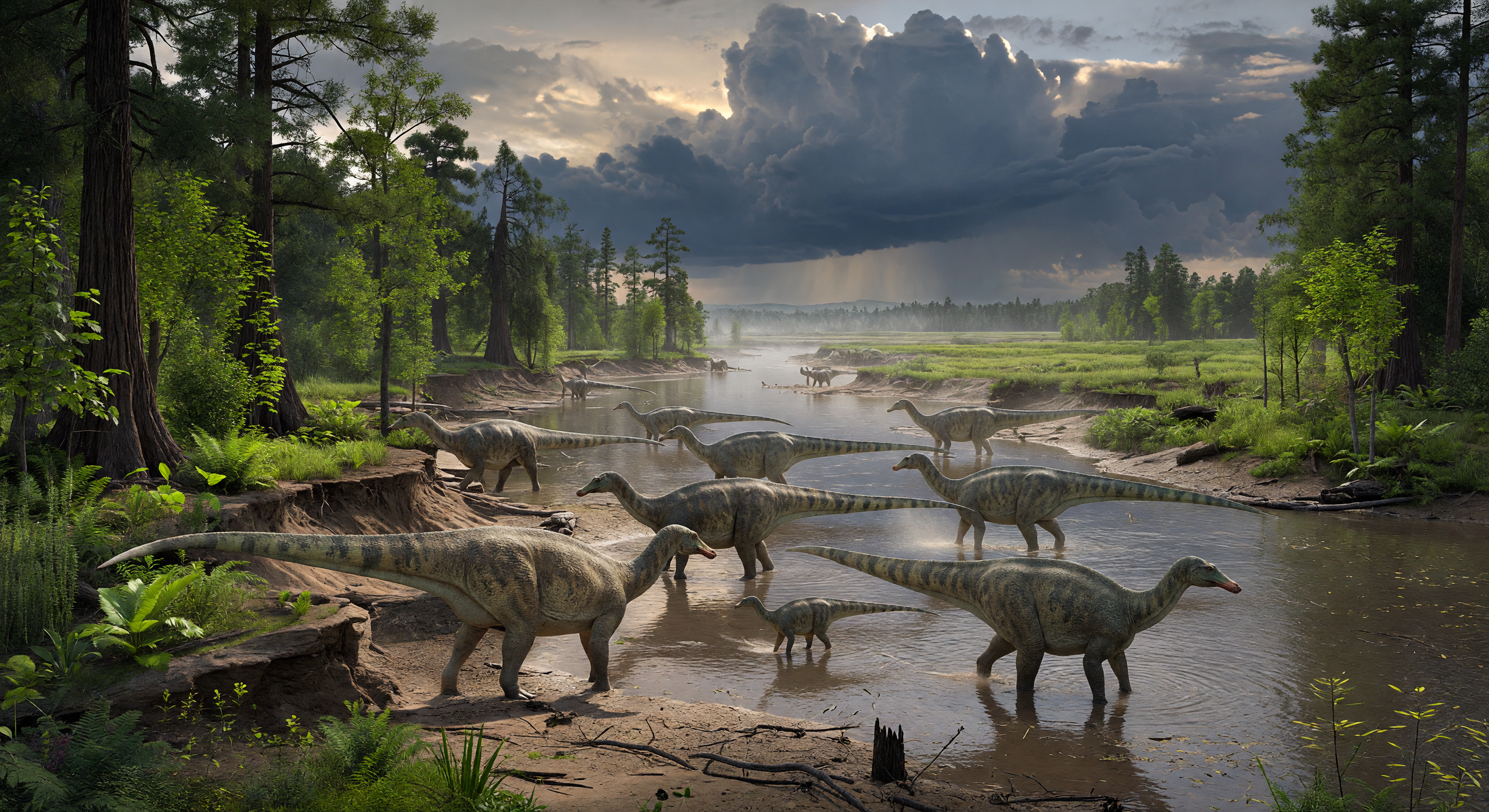 약 6,700만~6,600만 년 전 백악기 말, 오늘날 북아메리카 서부 라라미디아의 헬 크리크 지층 범람원에서는 거대한 초식 공룡 에드몬토사우루스 아넥텐스가 진흙빛 강물을 배 깊이 헤치며 무리를 지어 이동했습니다. 관람객은 수평으로 몸을 지탱한 약 10m 길이의 성체들과 더 작은 어린 개체가 탁한 수로를 휘저어 실트 구름을 일으키는 모습, 그리고 강둑을 따라 선 택소디움류 침엽수, 초기 속씨식물 나무, 무성한 양치식물 숲을 보게 됩니다. 이 습하고 계절적으로 젖는 범람원은 머드스톤·실트스톤·고운 사암이 쌓이던 환경으로, 티라노사우루스와 트리케라톱스가 살던 세계와 같은 마지막 비조류 공룡 생태계를 보여 주는 창입니다.