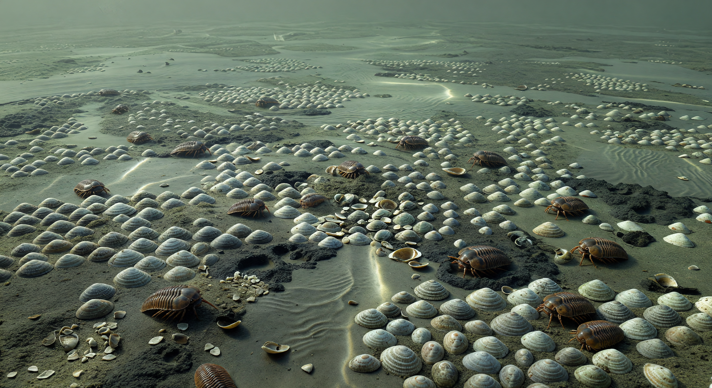 약 3억 8,300만~3억 5,900만 년 전 데본기 후기, 남반구 고위도 곤드와나의 차갑고 얕은 대륙붕 바닥에는 폭 3–8 cm의 완족류 오스트랄로스피리페르(Australospirifer)와 렙태나(Leptaena)가 빽빽한 조개층을 이루고, 그 사이로 밤색 외골격의 삼엽충 메타크리파이우스(Metacryphaeus)와 부르메이스테리아(Burmeisteria)가 진흙 위를 기어갑니다. 폭풍이 지나간 뒤 맑아진 녹회색 바닷물 아래, 잔물결 무늬가 남은 실트와 사암 렌즈, 부분적으로 묻힌 껍데기들이 드러나며, 이 장면은 산호초가 아닌 냉수성 말비노카프릭(Malvinokaffric) 동물군이 번성하던 남부 곤드와나 해역의 독특한 생태계를 보여 줍니다. 고요해 보이지만, 이 해저는 오늘날 남아메리카 남부·남아프리카·남극과 이어지는 고대 초대륙의 차가운 바다에서 이어진 깊은 시간을 품고 있습니다.