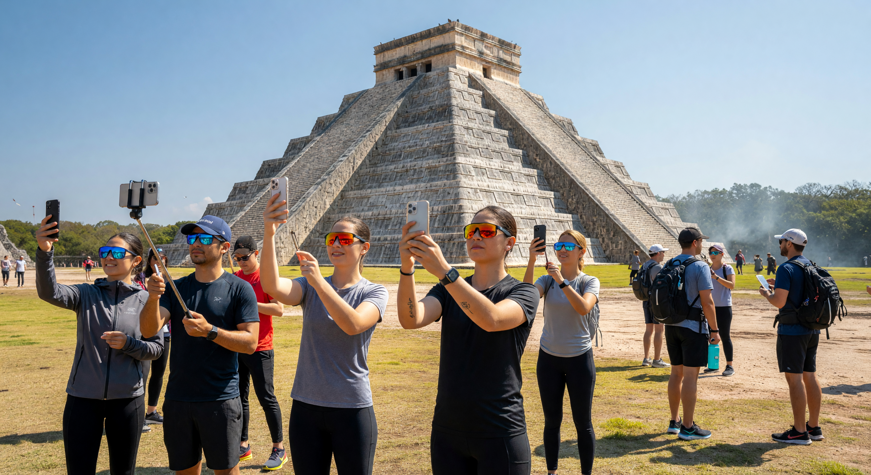 The image accurately captures a plausible early 21st-century tourist scene at Chichén Itzá, Mexico, with El Castillo (Temple of Kukulcán) prominently featured. The pyramid's architecture is spot-on: nine stepped terraces, steep 52-degree balustraded staircases on all four sides, limestone masonry, and the small summit temple, all matching historical records and photos of the site. Tourists wear appropriate Digital Age athleisure—leggings, shorts, hoodies, running shoes, baseball caps—and use smartphones on selfie sticks, with polarized-style mirrored sunglasses visible. The landscape (flat grassy plaza, low scrub vegetation, clear blue sky) aligns with the Yucatán site's geology and dry-season appearance; no anachronisms, culturally sensitive (diverse international group), visually coherent, and photorealistic. Minor note: light crowd size is typical for off-peak, enhancing plausibility.