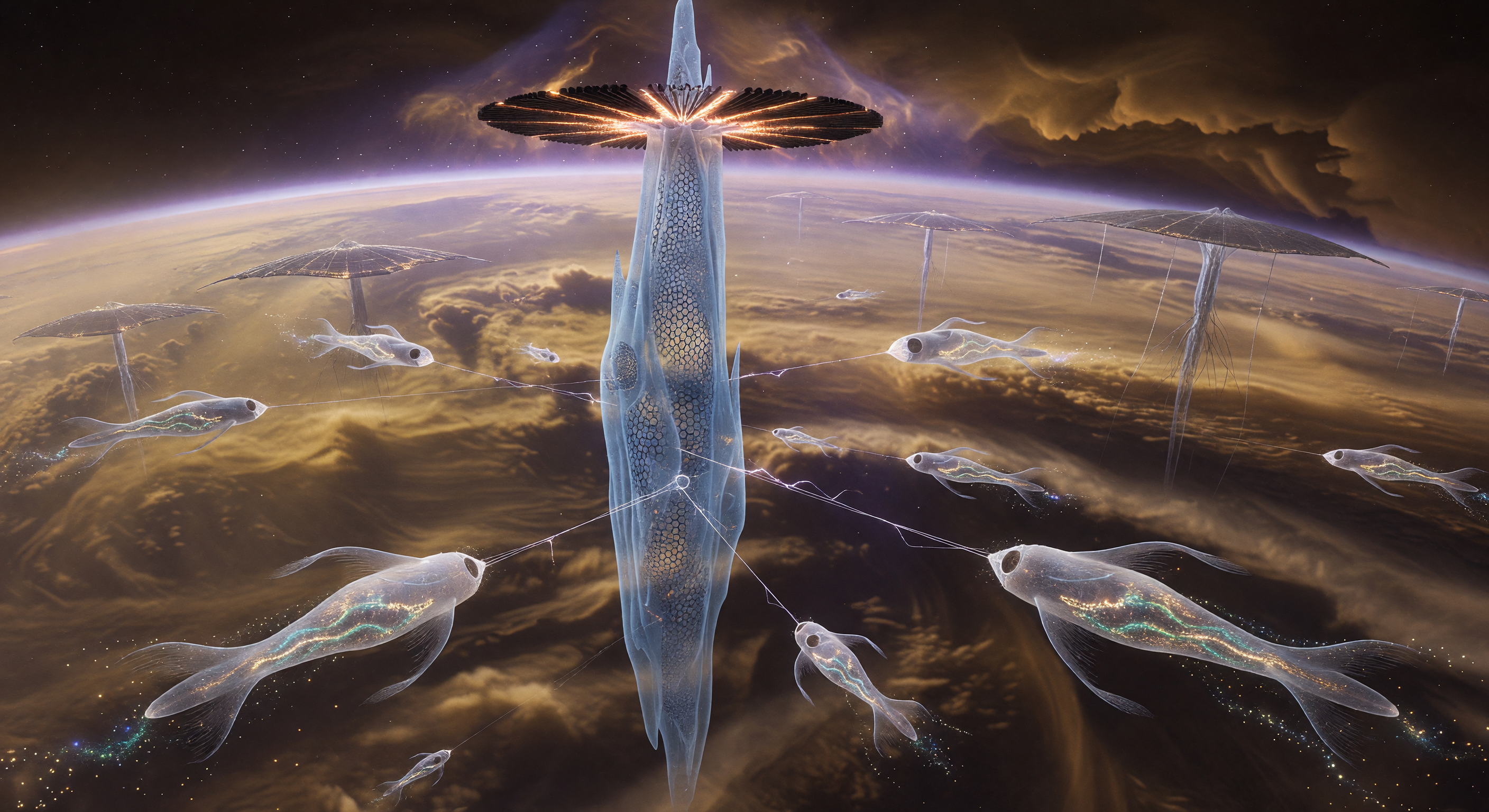 IMAGE ISSUES FOUND BY THE COMMITTEE: 1) The central structure is described as a graphene-reinforced aerogel spire, but while the translucent tower is plausible, the image does not clearly show graphene reinforcement or an aerogel-specific material texture beyond a general translucent/ceramic-like surface. 2) The glowing top structure is not unambiguously a set of ceramic radiators; it reads more as a wing/fan/antenna array, so the waste-heat radiator function is only implied, not clearly depicted. 3) The image does not show any explicit fusion-reactor hardware or exhaust geometry, so the caption’s fusion-reactor claim is unsupported visually. 4) The Nebulites are depicted as fish/tadpole-like organisms with tails/fins and eye spots, not as spindle-shaped post-human bodies. 5) There are no visible hydrogen bladders, internal buoyancy sacs, or electromagnetic sensor structures on the organisms. 6) The background “Wind-Trees” are ambiguous: they read visually like additional floating spires or infrastructure rather than clearly biological kilometer-long organisms. 7) The “iridescent clouds of radiotrophic sky-algae” are not distinctly visible as a separate biotic layer; the clouds look like ordinary atmospheric formations. 8) Claude also noted a possible near-orbital/high-curvature vantage issue: the curved limb makes the setting feel extremely high and expansive, which slightly strains the ‘within the atmosphere’ framing, though other reviewers considered this acceptable.