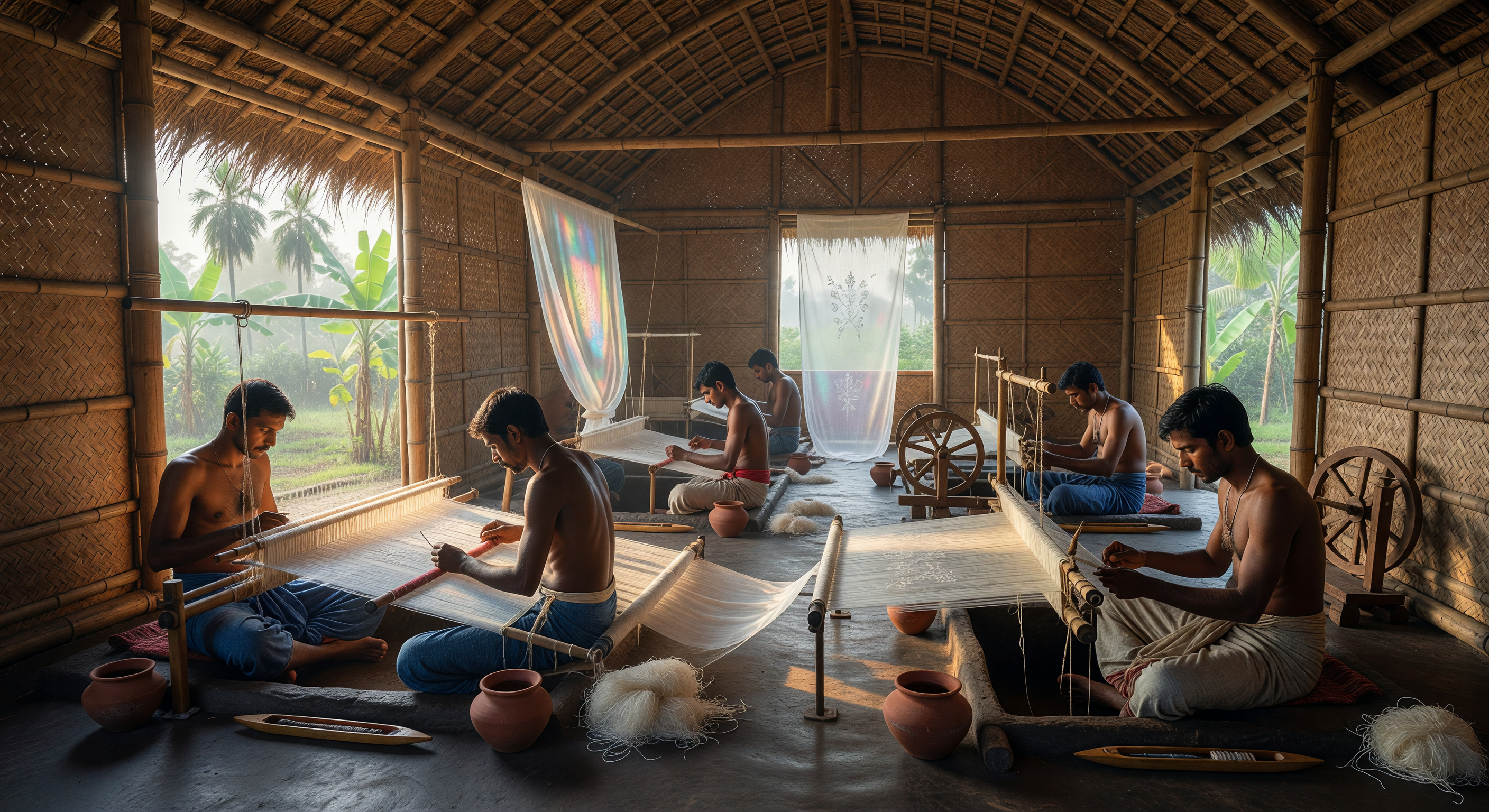 For the caption, the core subject—Bengal muslin (including very fine, luxury cotton textiles) in the 18th century—is historically consistent, but multiple claims are over-specific or not well-supported as written. “Do-chala” is a recognizable Bengali rural roof form, so that part is potentially fine, but the caption asserts jamdani production using “horizontal pit-looms and specialized bamboo splints” with “humid climate” as a decisive factor; while Bengal’s climate and weaving skill mattered, the caption implies a near-mechanistic link and introduces technical specifics that may not match the exact loom/tool depiction in the image. “Photi cotton” is also named as if it were a standard, singular cotton source/term tied directly to muslin production—this is at least partially questionable wording and could mislead viewers. Finally, “hand-operated charkhas” are mentioned as producing the luxury export, but spinning (charkha) and weaving (loom) are distinct stages; the caption blurs the process and assigns certain terms/technologies without confirming they are present or accurate for this workshop scene.
