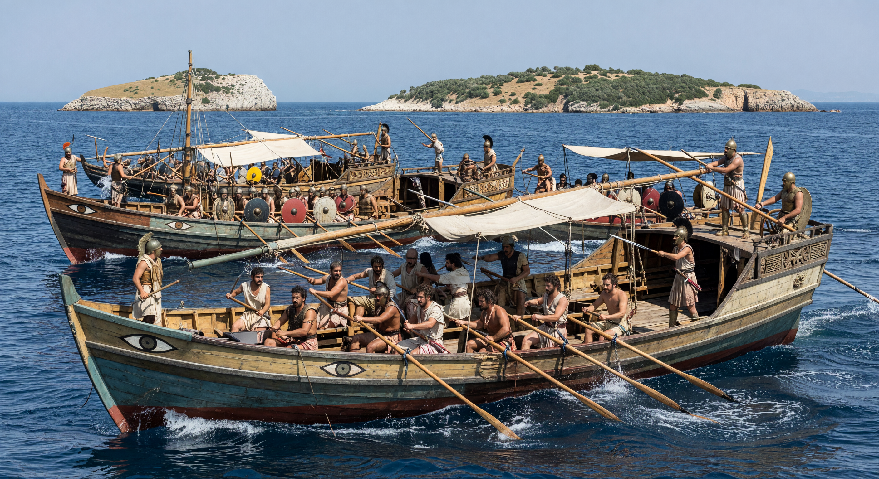 이 이미지는 생생한 해전 장면을 나타내지만, 선박 자체의 묘사에서 중요한 문제가 있습니다. 고대 그리스의 트리레미는 대략 37미터 길이, 매우 좁은 (폭 약 5.5미터) 올림픽과 함께 3단계의 노를 특징으로 했습니다 — 그것이 그들의 정의적 특성이며 이름의 기원입니다. 여기 보여진 선박들은 너무 짧고, 너무 넓고, 너무 부피가 큽니다. 그들은 최고의 경우 작은 갤리선이나 펜테콘터와 더 가깝고, 트리레미의 독특한 길고 매끈한 형태가 결여되어 있습니다. 보이는 노 정렬은 단일 단계로, 트리레미는 그들의 특색 있는 3개의 뱅크(탈라미트, 자이기트, 트라니트)를 가지고 있었습니다. 프로우에 그려진 눈들은 시대에 적합한 멋진 터치이며, 승무원의 일반적인 의상 — 튜닉과 최소한의 갑옷 —은 그 시대에 폭넓게 받아들여질 수 있으며, 헬멧(코린트 스타일도 일부 포함)과 원형 방패(아스피드)의 존재도 마찬가지입니다. 에게 해의 섬 배경은 진정성 있어 보이며 분위기도 좋습니다. 다만 수면에 보이는 청동 ram의 부재는 트리레미 전투에서 충돌이 얼마나 중요했는지를 고려할 때 주목할 만한 생략입니다. 일부 말려진 캔버스 차양/돛은 합리적이며, 전투 전에 일반적으로 돛이 내려질 것입니다.
