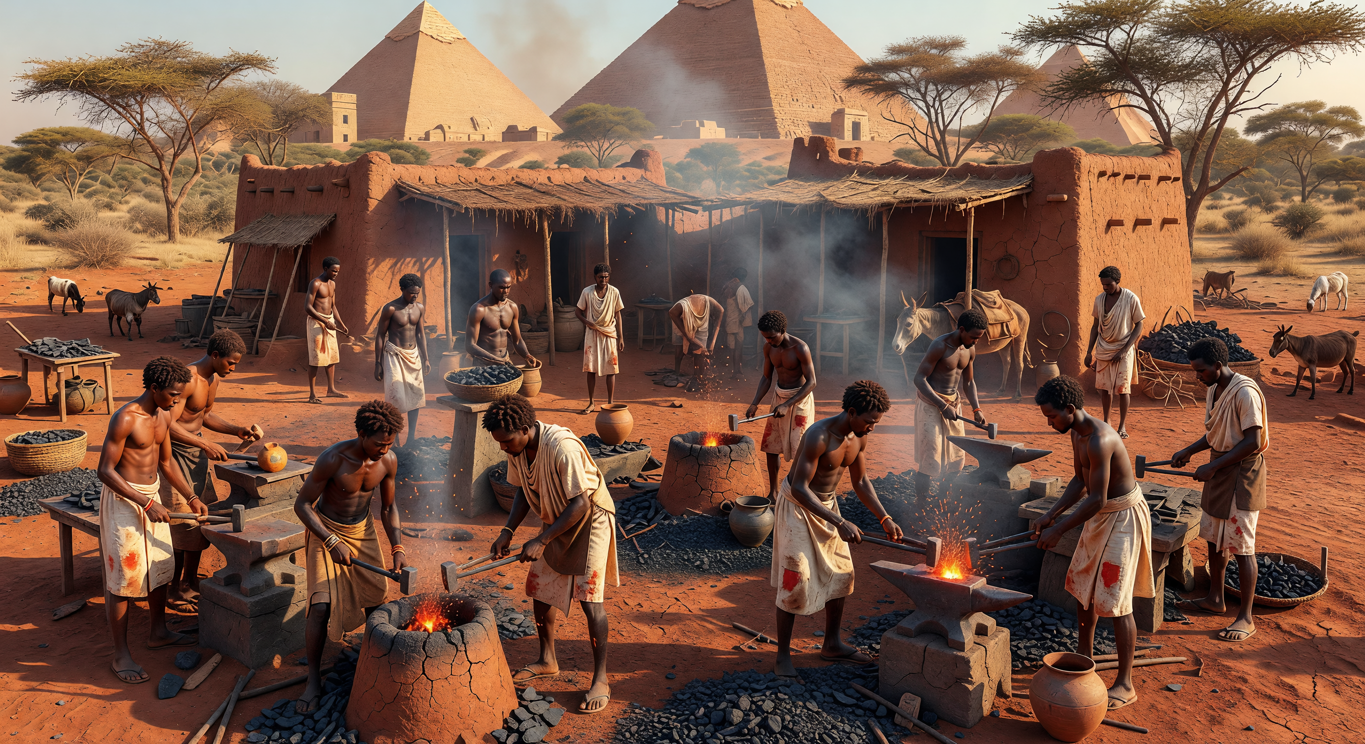 기원전 1세기 말 메로에의 제철 지구에서는 쿠시 왕국의 대장장이들이 붉은 흙바닥 위에서 점토 용광로를 달구고, 막 꺼낸 철괴를 집게와 망치로 두드리며 다듬고 있다. 검게 그을린 가마, 슬래그 더미, 숯 바구니, 풀무가 빽빽한 이 작업장은 메로에가 고대 아프리카의 중요한 철 생산 중심지였음을 보여 주며, 이런 금속 생산은 농업·전쟁·교역을 떠받치는 핵심 산업이었다. 멀리 보이는 가파른 사면의 피라미드는 이곳이 단순한 공업 지대가 아니라, 사하라 이남과 이집트·홍해 세계를 잇는 강력한 쿠시 왕국의 수도권이었음을 생생하게 드러낸다.