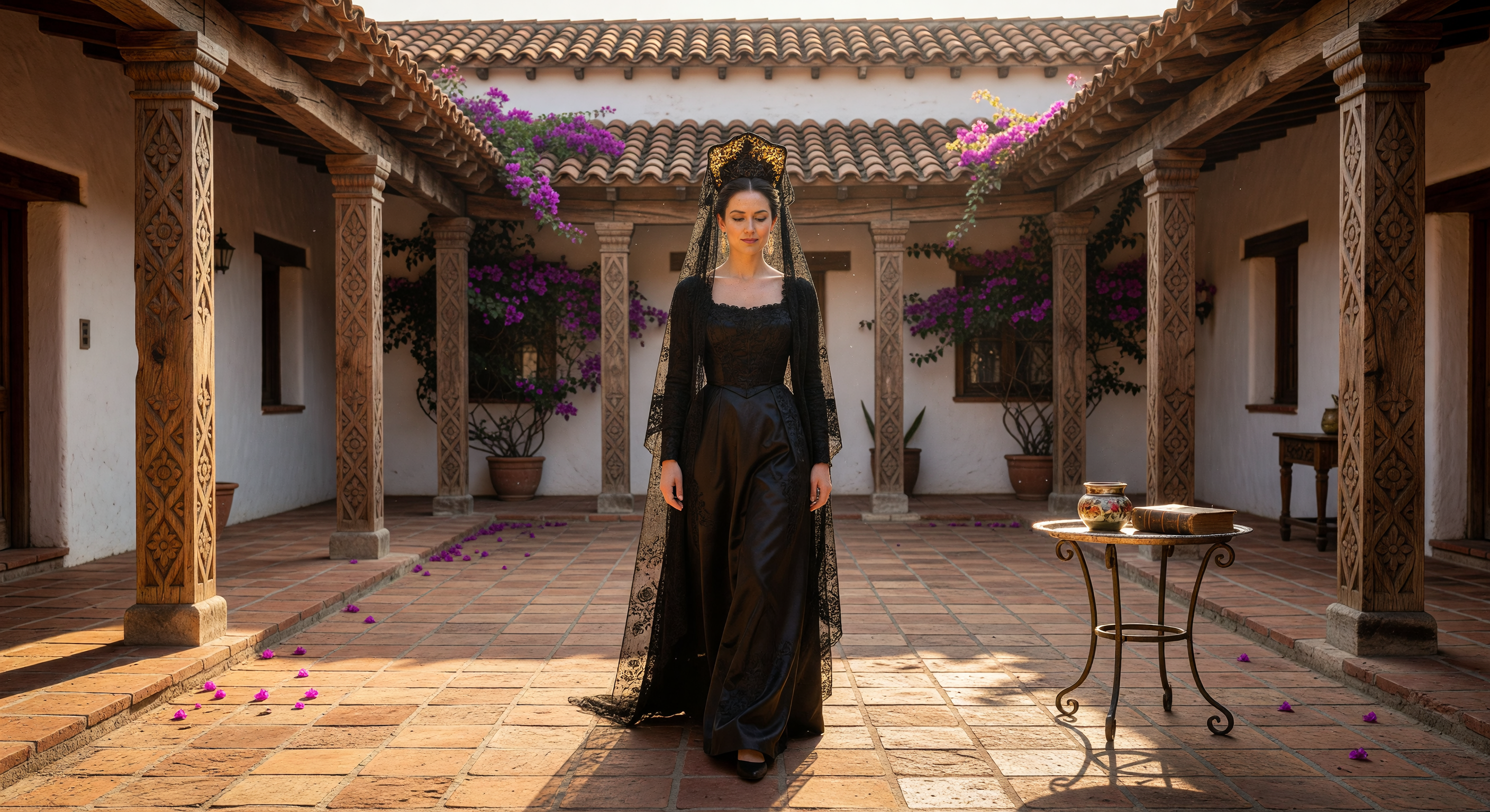However, several details reduce historical specificity: the woman’s outfit reads as a stylized/European court fashion hybrid rather than a clearly mid-19th-century Mexican hacienda elite ensemble. The mantilla/comb is present (partly matching the caption), but the footwear and bodice/dress silhouette and the overall “black silk gown” styling feel more generic and possibly later-19th-century or even non-local in cut. Also, the decorative table with a glass jar/visible contents and the small still-life props could be accurate, but they are not clearly period-specific for a mid-19th-century Mexican courtyard and risk looking staged or modern.