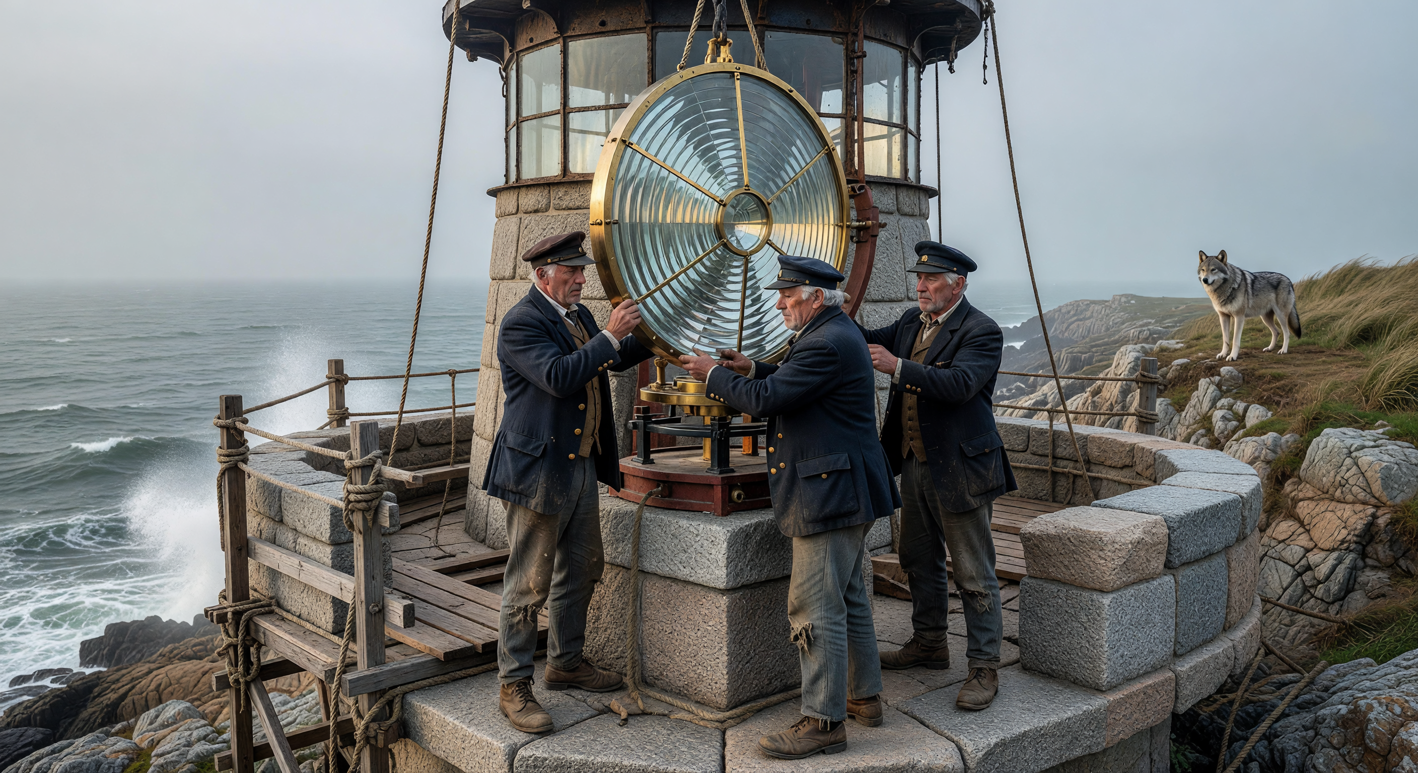 IMAGE issues identified by the committee: 1) a wolf on the hillside is an anachronistic/implausible fauna element for a 19th-century North Atlantic lighthouse coast, 2) the wolf is visually distracting and breaks the historical scene, 3) the workers’ dark peaked-cap uniforms may read as overly military or dramatized to some viewers, 4) the mix of semi-formal jackets with ragged or inconsistent trousers slightly weakens coherence, 5) one reviewer felt the lens geometry looked more like a panel/diaphragm than a fully convincing Fresnel prism assembly, though others disagreed, 6) the installation positioning is somewhat ambiguous, appearing more like an exterior gallery/platform scene than a clearly documented lantern-room interior installation, 7) the animal/fauna detail is the only clear historical error unanimously emphasized.
