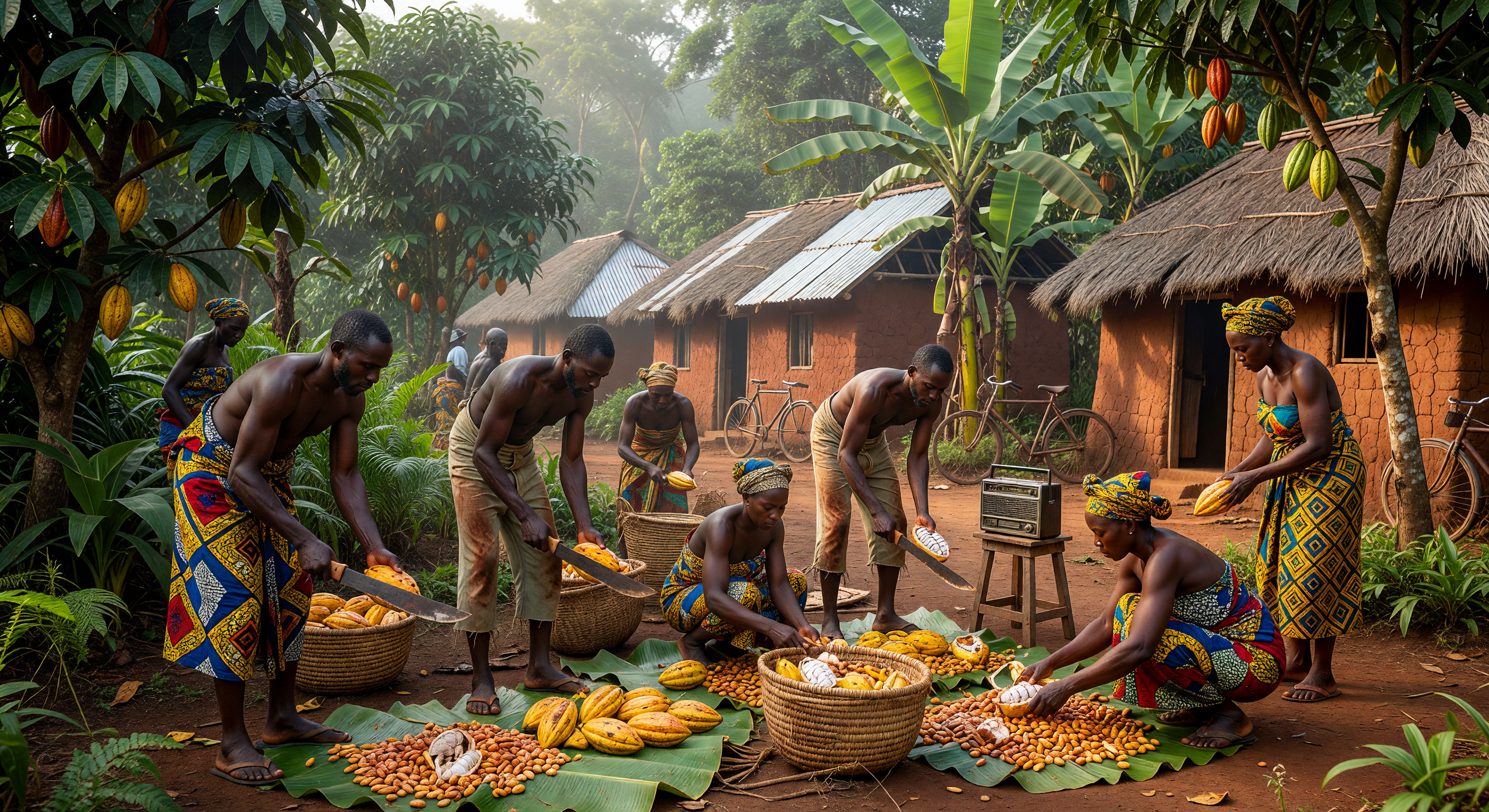 이 이미지는 196년대 중반의 가나 농촌 지역, 특히 아샨티 코코아 재배 지역에 대한 역사적 및 문화적으로 정확합니다. 묘사된 요소는 Theobroma cacao 나무에서 길게 익은 코코아 꼬투리가 현실적인 노란색-주황색-적색의 색조로 표현되어 있으며, 식물학적 정확성과 일치합니다. 노동자들은 마체테를 사용하여 꼬투리를 쪼개고 젖은 콩을 추출하여 바나나/플랜틴 잎 위에 펼치는 모습이 보여지며, 이는 수확 후 가공의 표준 초기 단계입니다. 의상은 남성과 여성 모두에게 196년대 서아프리카에서 일반적인 생생한 왁스 프린트 원단으로 이루어져 있으며, 작업에 적합한 실용적인 반바지/바지와 둘레가 함께 있습니다. 건축은 이음매와 흙으로 지은 오두막에 파형 철 지붕이 있으며, 이는 196년대 독립 이후 농촌 지역의 현대화를 반영합니다. 배터리로 작동하는 트랜지스터 라디오가 의자 위에 있고 자전거가 196년대의 세부사항으로, 은크루마 시대의 진보를 불러 일으킵니다. 붉은 레터라이트 토양, 무성한 열대 식생(유채나무, 바나나), 안개가 낀 숲 가장자리 환경은 아샨티 지역의 생태학과 일치합니다. 시대착오적 요소는 없으며 시각적으로 일관되고 그럴듯합니다.