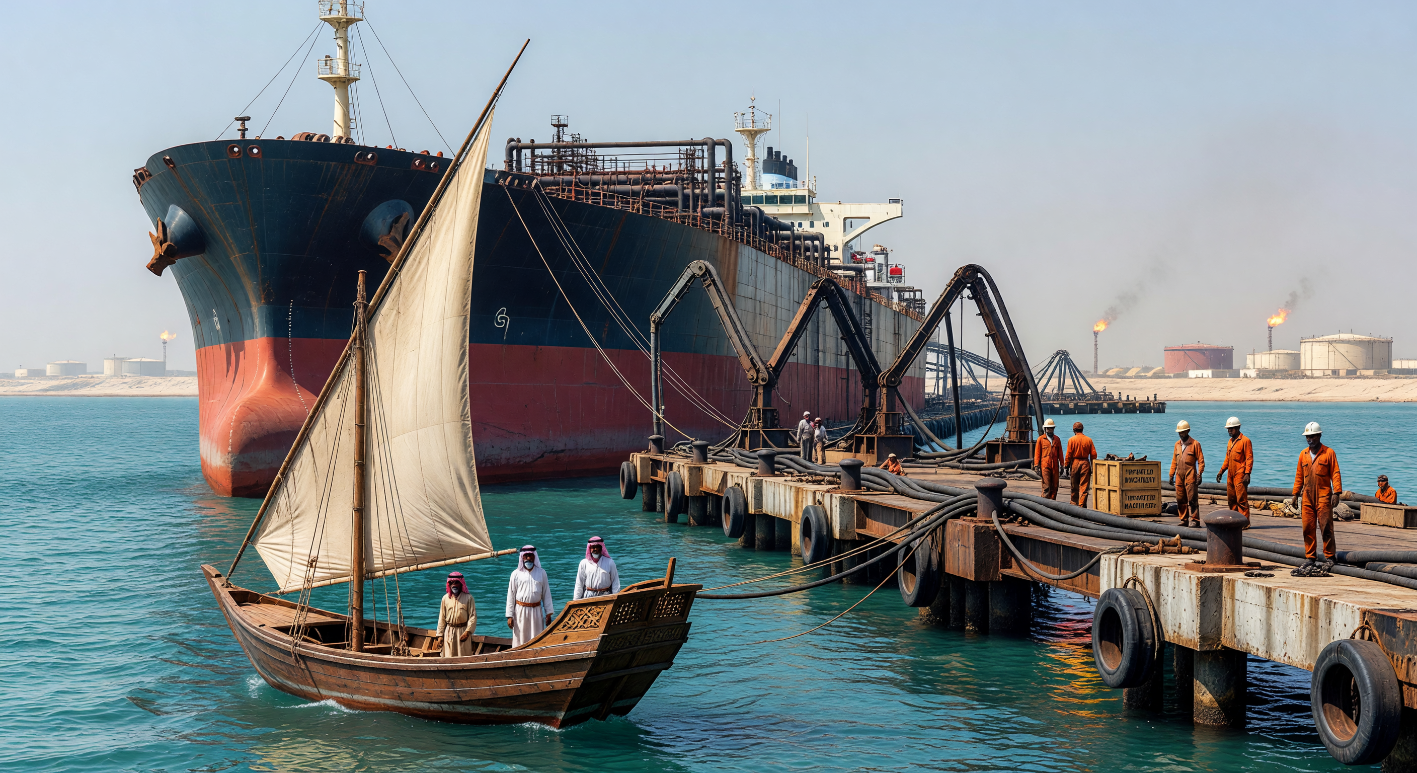 The image effectively conveys the core narrative of old versus new in the Persian Gulf oil era. The supertanker is rendered with convincing detail—dark hull with red antifouling paint, loading arms, and the industrial pier infrastructure are all plausible for a late 1970s oil terminal. The background features gas flares and storage tanks consistent with Ras Tanura's refinery complex. The traditional wooden dhow with its lateen sail and the men in white thobes and red-checkered ghutras are culturally appropriate for Saudi Arabia. The turquoise water color is consistent with the shallow Persian Gulf coast.