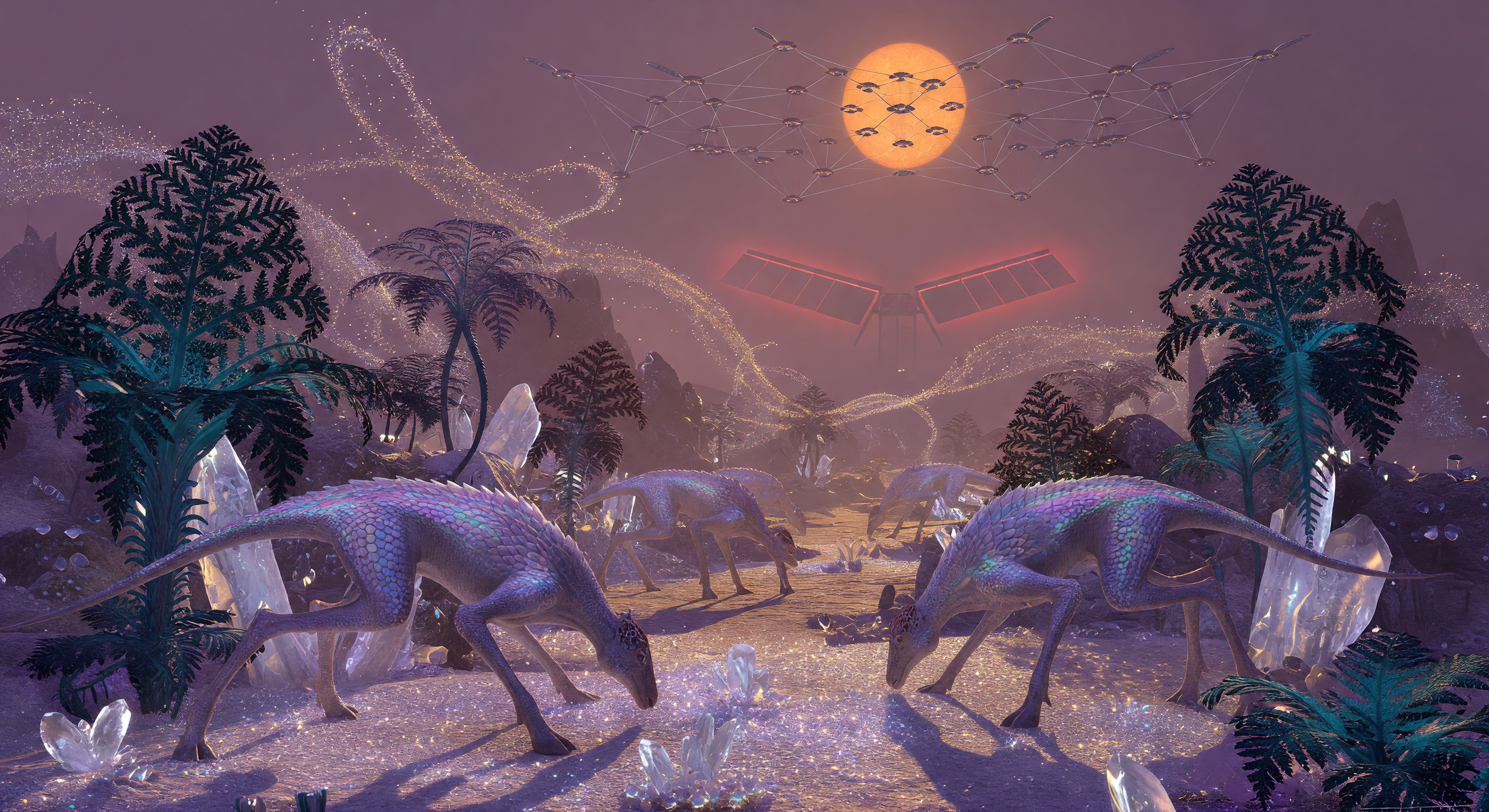 CAPTION issues identified by any reviewer: 1) “Hexapedal herbivores” is contradicted by the image, which shows quadrupeds. 2) “Thermal-imaging pits” are asserted but not visually discernible. 3) “Translucent bio-silica armor” is too specific; the image suggests iridescent scales/crystalline surfaces rather than clearly defined armor. 4) “Obsidian fractal ferns” is overly specific; the plants are dark and fractal-like, but not clearly obsidian. 5) “Aero-plankton” is plausible but interpretive rather than directly evidenced; the sky particulates are visible, but their biological nature is not explicit. 6) “Violet atmosphere” is supported only in a loose interpretive sense and is not an exact, clearly demonstrated atmospheric property. 7) “Massive radiator fins of a Seeder station” is plausible but not unambiguously identifiable from the image. 8) “Dyson-Direct Swarm” is consistent with the visible lattice, but remains a lore-heavy identification that could be softened if strict visual fidelity is desired. 9) The caption overall over-specifies several technical details not directly corroborated by the artwork, causing narrative drift between text and image.