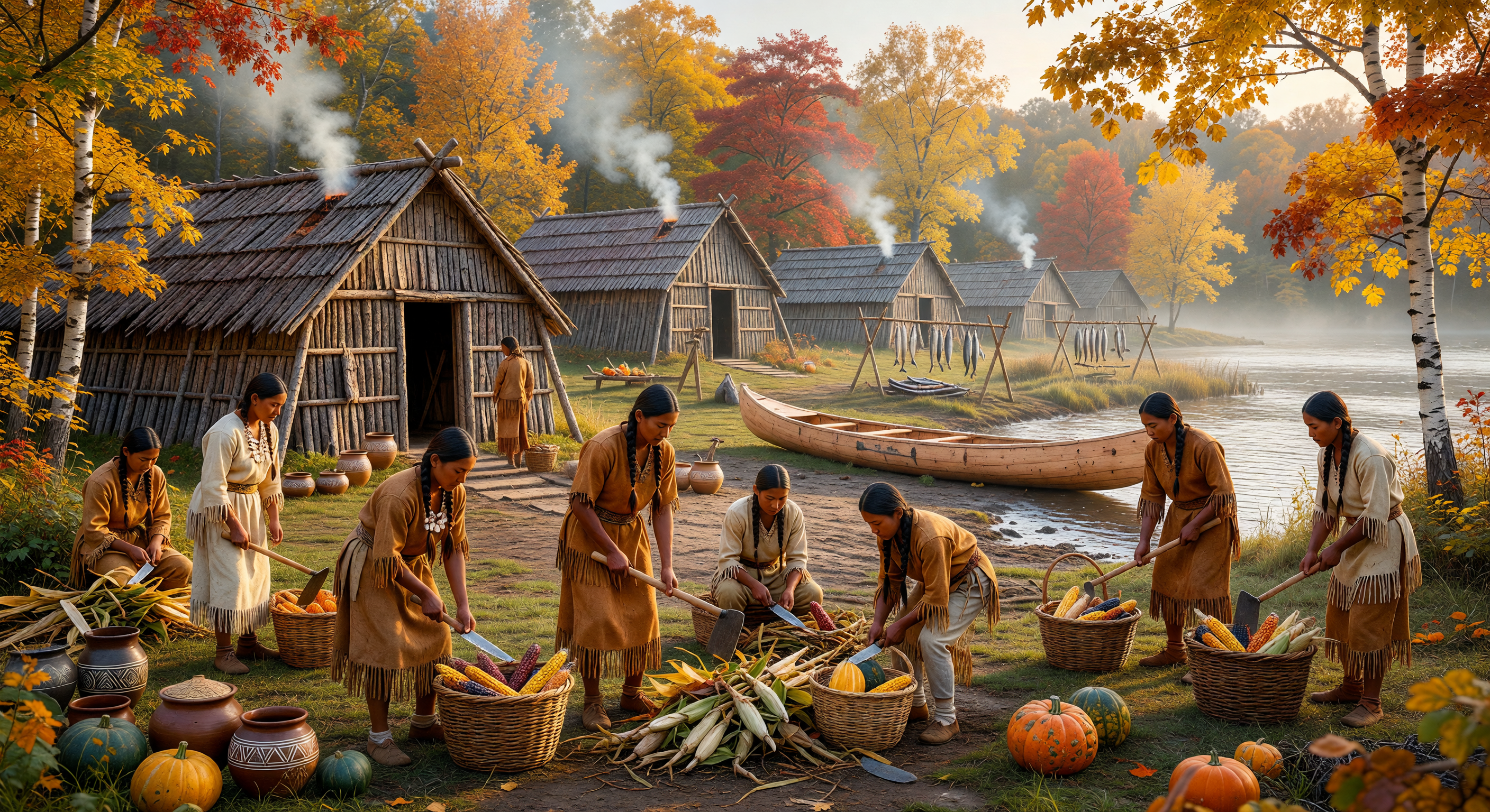 13세기 세인트로렌스 강 유역의 황금빛 가을 풍경 속에서 초기 이로쿼이 원주민들이 '삼자매' 농법의 결실인 옥수수와 호박을 수확하며 다가올 겨울을 준비하고 있습니다. 삼나무와 느릅나무 껍질로 정교하게 지어진 롱하우스 너머로 평화로운 연기가 피어오르고, 사슴 가죽 의복을 입은 주민들은 돌과 뼈로 만든 도구를 사용하여 분주히 일손을 움직입니다. 강변에 정박한 통나무 카누와 교역의 흔적인 조개껍데기 장신구는 수렵 채집에서 정착 농경으로 이행하던 이들의 고도화된 사회 구조와 생태적 조화를 생생하게 보여줍니다.