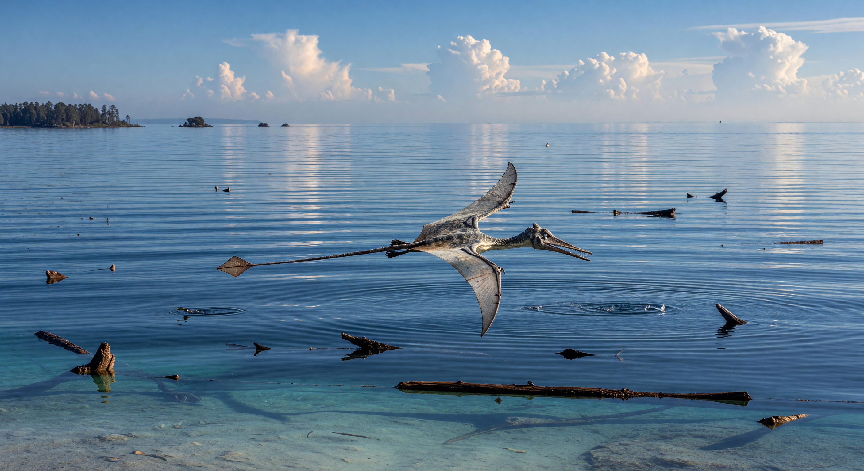 The image captures a genuinely compelling Rhamphorhynchus in flight, and the most scientifically important features are well-rendered: the long stiffened tail with a diamond-shaped vane at the tip is clearly visible and anatomically correct, the elongated toothed jaws are appropriate, and the narrow wing planform is consistent with rhamphorhynchid morphology. The pterosaur's pose skimming low over water, consistent with skim-feeding or fish-hunting behavior, is plausible and evocative. The turquoise-to-blue water gradient does effectively suggest a shallow shelf transitioning to deeper water, matching the caption's description. However, the most significant issue with the image is the vegetation visible on the distant islands/shoreline, which appears to be coniferous trees resembling modern pines or spruces. While conifers existed in the Jurassic, they would not have had this strongly modern appearance — Jurassic conifers were more diverse and often had different silhouettes. Additionally, there are numerous logs floating in the foreground shallows, which is a compositionally odd choice that makes the scene feel more like a present-day lake (e.g., Lake Tahoe aesthetically) than a Mesozoic marine carbonate platform. The overall color palette and photographic quality reinforce this 'modern lake' impression noted by the previous reviewer, which undermines the historical authenticity.