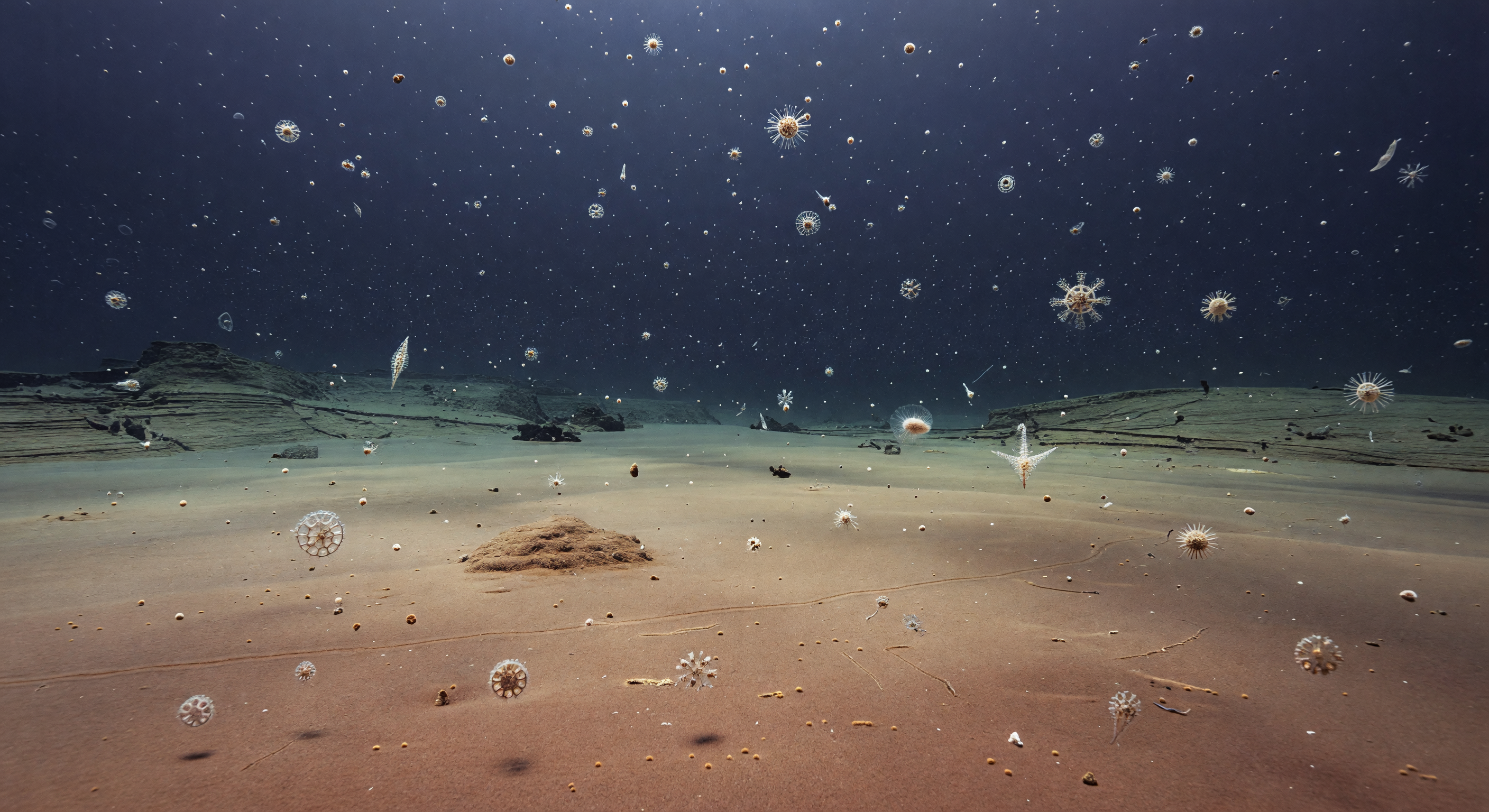 I agree with the consensus on the image's need for adjustment regarding scale and morphology. However, I believe my colleagues were slightly too harsh on the color choice; the reddish sediment is a hallmark of these specific paleo-environments. My recommendation for adjustment is to reduce the size and complexity of the 'snow' to better reflect true microscopic scale and to soften the seafloor texture to minimize the appearance of stratified rock, focusing instead on the soft, unconsolidated nature of the ooze.