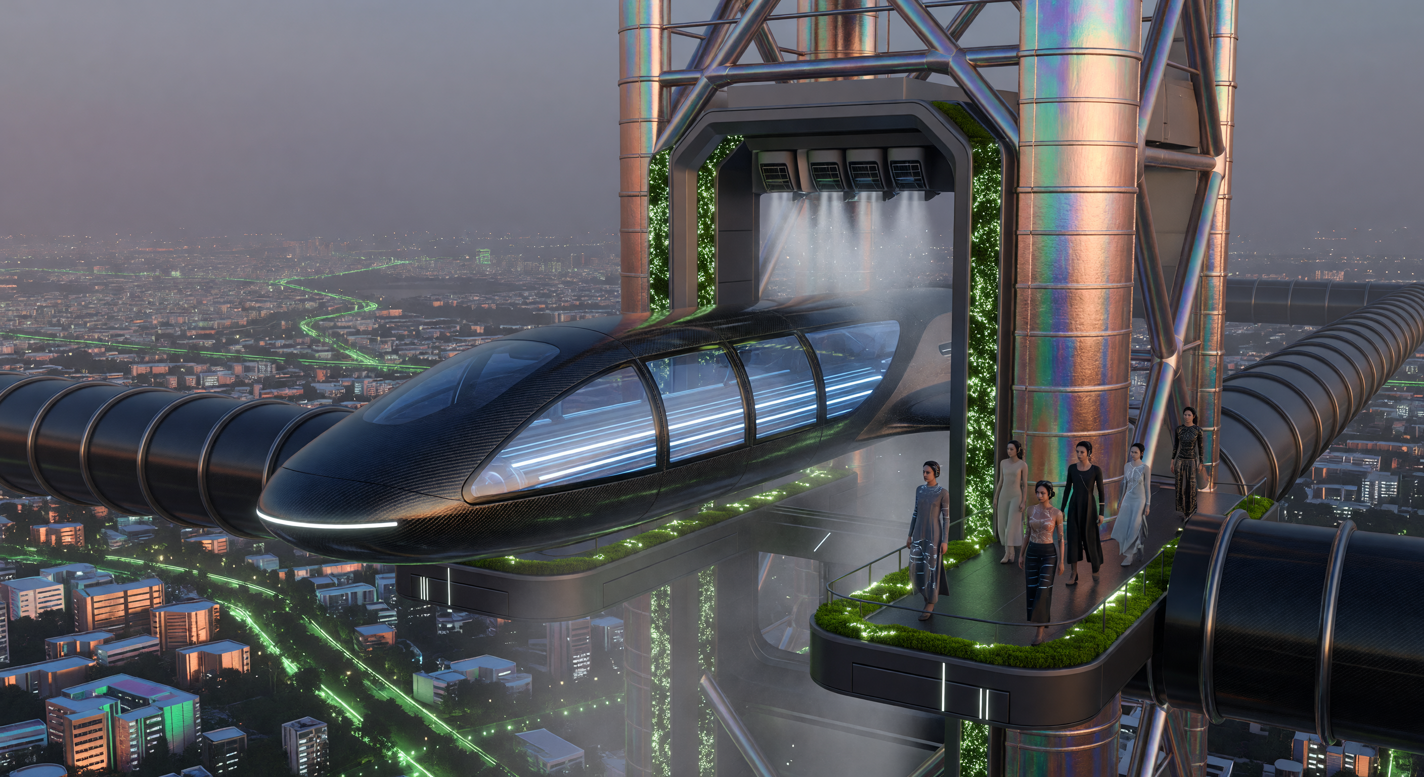 The image presents a visually coherent and technically plausible near-future transportation hub. The carbon-fiber-textured maglev pod is convincingly rendered, the elevated tubular track infrastructure is internally consistent, and the vertical greenery integrated into the tower structure is a believable 2042-era design choice. The aerial cityscape below reads as a dense South Asian megacity at dusk, though it lacks specific Mumbai identifiers (no coastline, no recognizable landmarks like the Bandra-Worli Sea Link or Gateway of India silhouette). The figures on the platform wear flowing garments that blend South Asian silhouettes (draped fabrics, salwar-like cuts) with futuristic minimalism, which is culturally appropriate and a genuine strength of this image. The ambient mist/cooling vapor visible at the docking portal is a nice detail supporting the 'pressurized environment' claim in the caption.