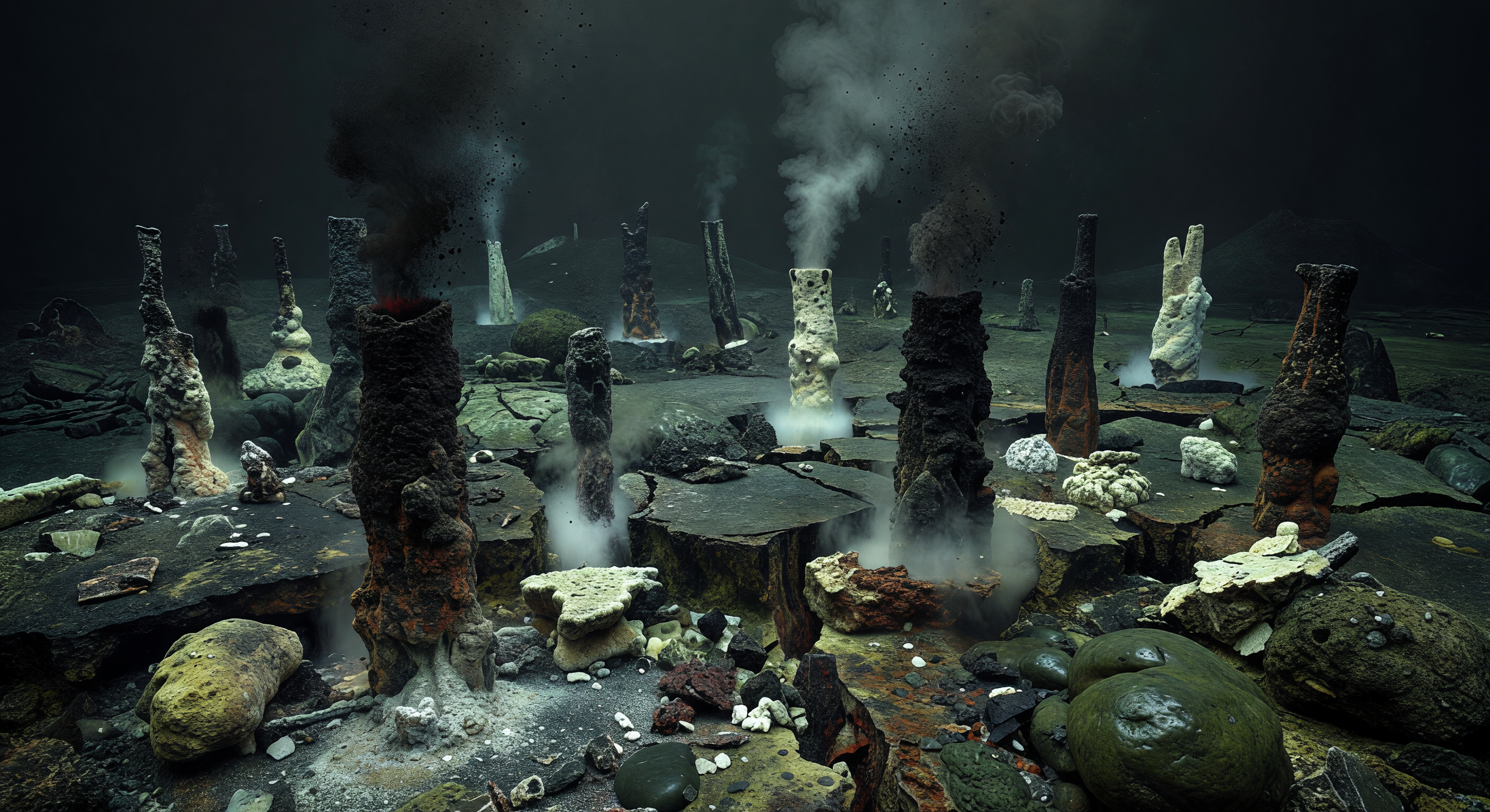 IMAGE issues identified by the committee: 1) several vent chimneys look overly stylized and architectural, with bulbous, vase-like, hourglass, or overly uniform upright forms rather than irregular precipitate-built vent structures; 2) some tall foreground vertical elements can read like manmade pylons or artificial posts; 3) the scene uses rust-orange/reddish oxidation tones that are anachronistic or at least too oxygenated-looking for a strictly anoxic Hadean ocean; 4) the green-tinted rocks and moss-like green patches are ambiguous and may be misread as biological growth rather than mineral crusts; 5) the water column and lighting feel too clear/cinematic in places, with insufficient murk and suspended particulate complexity for a deep Hadean vent environment; 6) some mineral textures are polished and decorative rather than raw, chaotic geologic precipitates.