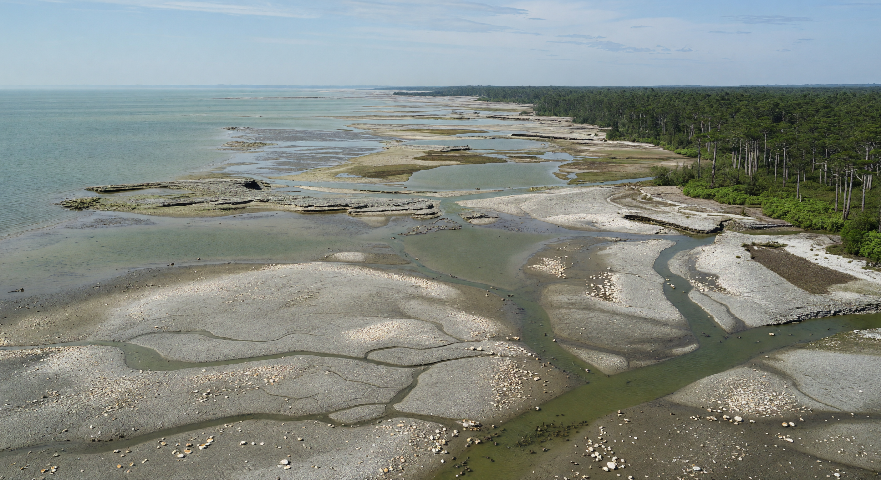 그러나 이미지는 근본적으로 문제가 있습니다. 이는 온대 또는 아열대 조간대 평탄지의 현대 항공사진처럼 보이며, 아마도 대서양 연안이나 멕시코만 연안 어딘가일 가능성이 있습니다. 내륙 쪽 가장자리를 따라 나타나는 식생은 분명히 현대적입니다. 소나무나 다른 현대 침엽수를 연상시키는 가늘고 긴 줄기의 키 큰 나무들과, 속씨식물 관목으로 이루어진 빽빽한 하층 식생이 보입니다. 이 식물상에는 조금도 고생대적인 요소가 없습니다. 석탄기의 석탄 습지 숲이라면 Lepidodendron과 Sigillaria의 특징적인 기둥 모양 비늘껍질 줄기(높이 30m 이상에 달하는 교목성 석송류), 거대한 Calamites 속새류의 마디진 줄기, 그리고 큰 엽체를 지닌 종자양치류가 나타나야 하며, 이는 어떤 현대 숲과 비교해도 완전히 이질적인 조합입니다. 진흙 평탄지와 조석 수로 자체는 일반적인 퇴적 환경 유추로서 지질학적으로 그럴듯하고, 흩어진 패각 잔해도 좋은 디테일이지만, 이 패각들은 석탄기 환경에서 기대되는 완족류, 크리노이드 줄기절, 망상형 태형동물 조각이 아니라 현대의 이매패류처럼 보입니다.