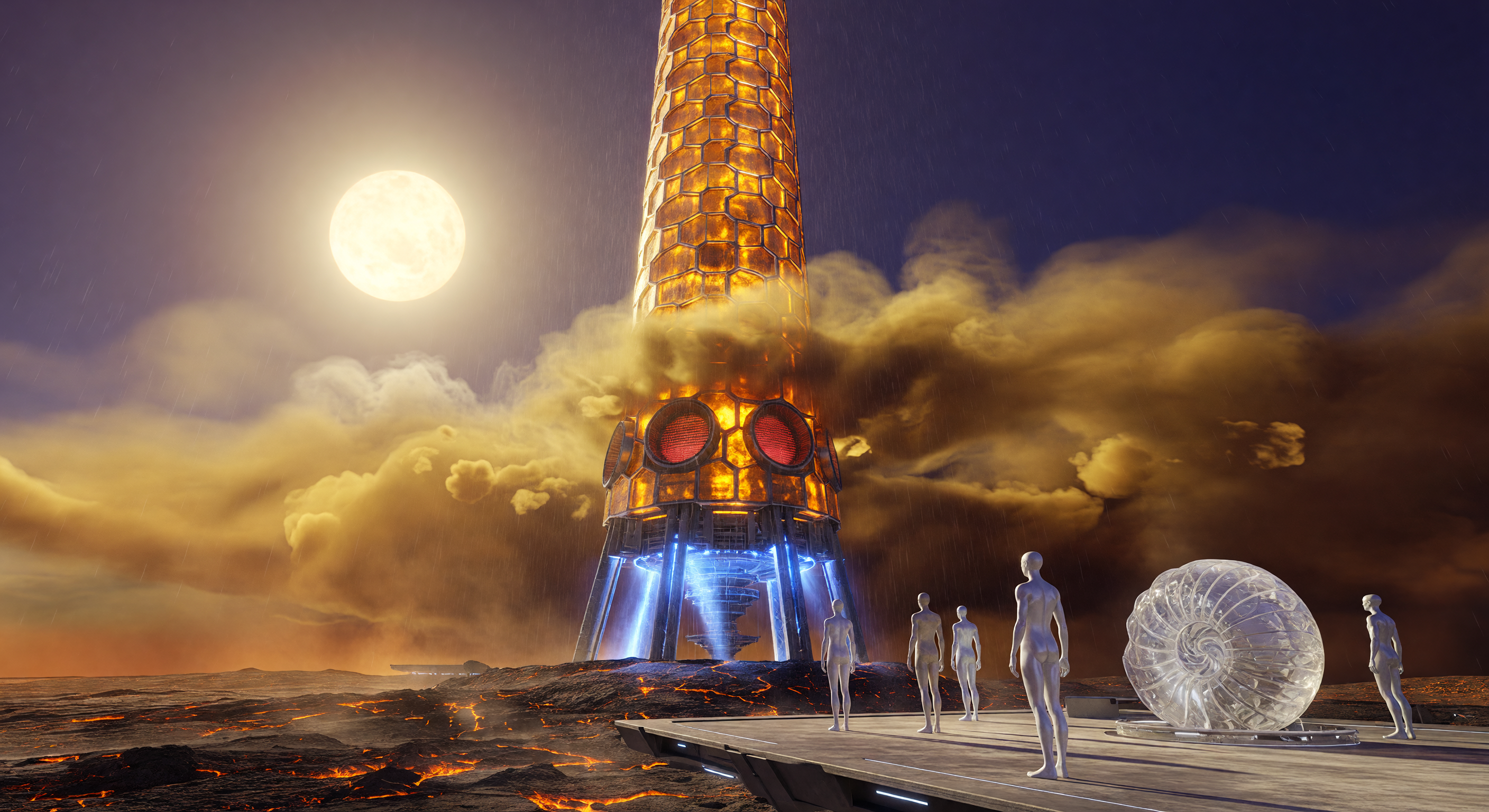 The committee agrees that the image successfully conveys a far-future Venus terraforming megastructure: a massive industrial tower with glowing intake/energy elements, a harsh alien atmosphere, and post-human observers in an advanced speculative setting. The caption’s overall premise is also coherent with the intended Interstellar Dawn / Venus-Prime concept and the architectural-urbanism focus.