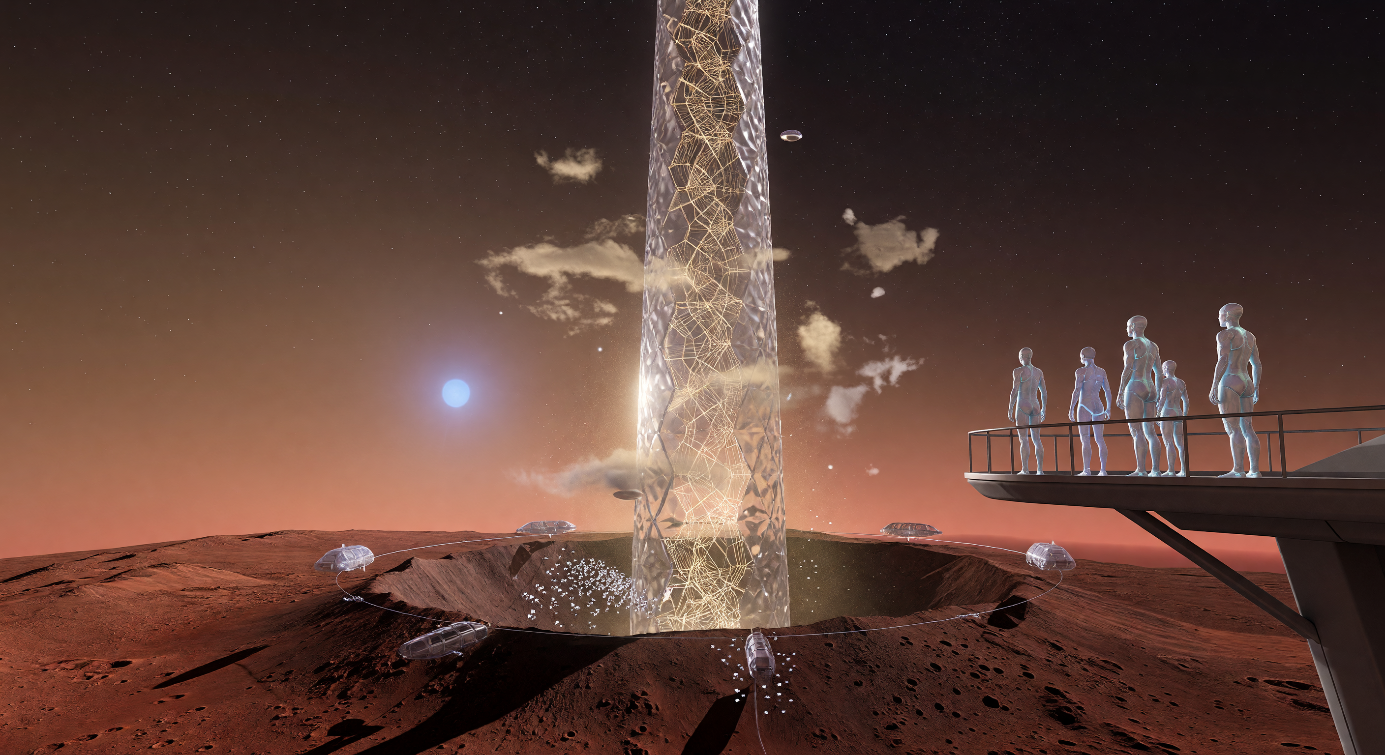 IMAGE issues identified by the committee: 1) The scene shows atmospheric haze/clouding that is inconsistent with the very thin Martian atmosphere at the stated setting; the sky should be starker, with less visible scattering and a blacker, more vacuum-like background. 2) The floating, balloon-like objects near the surface and around the crater rim are visually ambiguous and read like conventional balloons; their buoyancy/survival in Mars’s low-pressure environment is not clearly justified. 3) The figures are only mildly elongated and do not strongly communicate a distinct .38g-adapted post-human morphology. 4) The image includes small cloud-like patches that may be mistaken for Earth-like clouds rather than dust, stabilizers, drones, or other clearly explained phenomena. 5) One reviewer also noted the need to clarify figure clothing/opacity and overall low-atmosphere rendering so the scene reads more consistently as a Martian exosphere-adjacent installation rather than a denser-atmosphere setting.