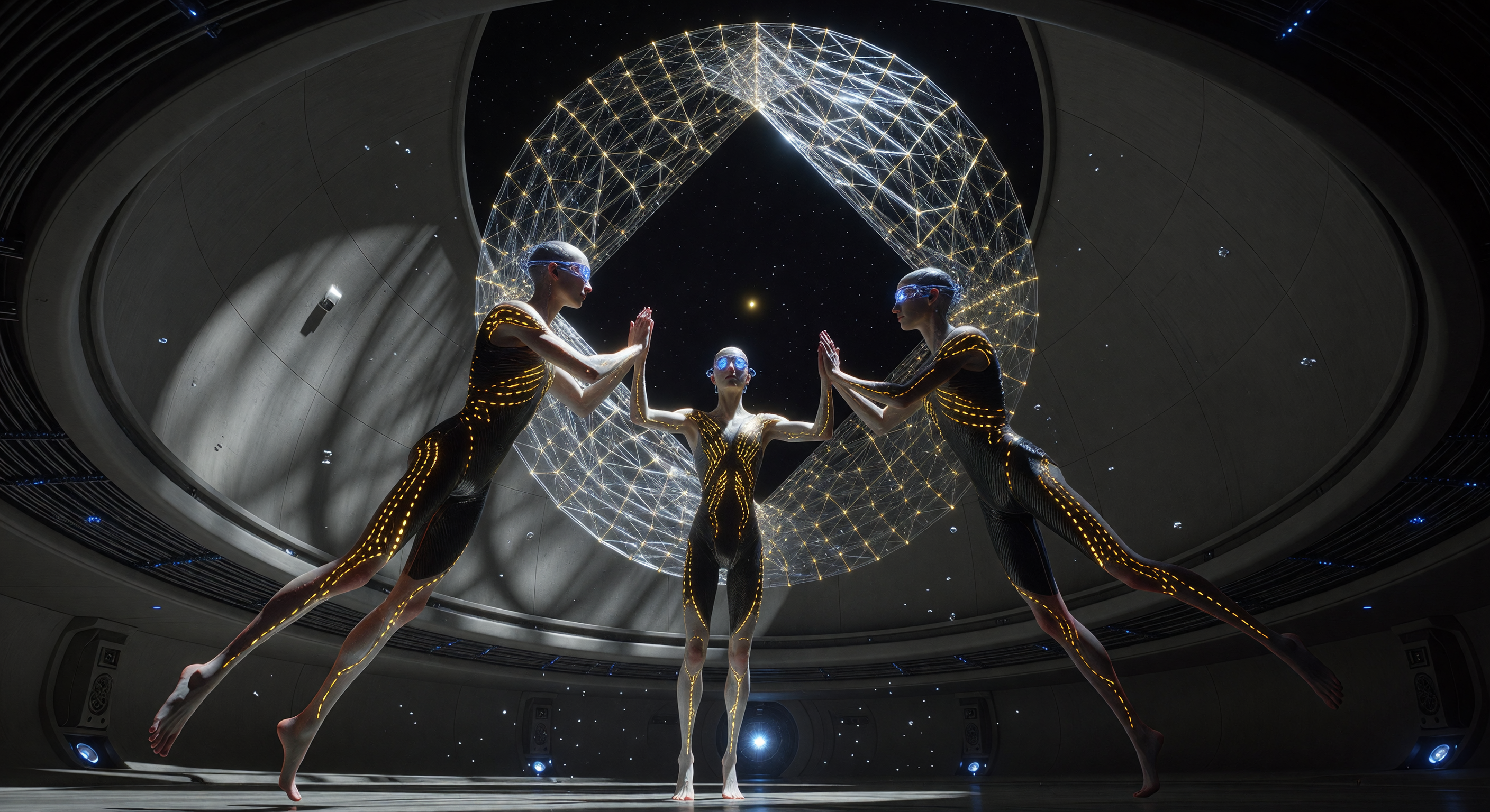 Paragraph 2: IMAGE issues identified by the committee: 1) The zero-gravity claim is not clearly supported because the figures appear to be standing or anchored on a floor/frame rather than floating; Claude and Gemini explicitly flagged this, while Grok interpreted the pose as floating. 2) The “optical-lattice telescope” is only partially represented: it reads more like a geodesic dome aperture, sensor array, or interferometric structure than a clearly legible telescope. 3) The caption’s specific anatomy claims are not visually evidenced, and by extension the image does not clearly show pressurized fluid sacs or any overt non-human anatomy beyond elongated limbs and stylized body proportions. 4) The image supports elongation only loosely; the figures are slim and extended, but not unmistakably the radical evolutionary morphology described. 5) The figure posture may be read as ballet-like or ritualized rather than a clearly scientific observational stance, which weakens the observatory/telescope reading for some reviewers. 6) No major anachronistic modern object or geographic/biological mismatch was identified, but the technical clarity of the observatory hardware is insufficient for the caption’s level of specificity.