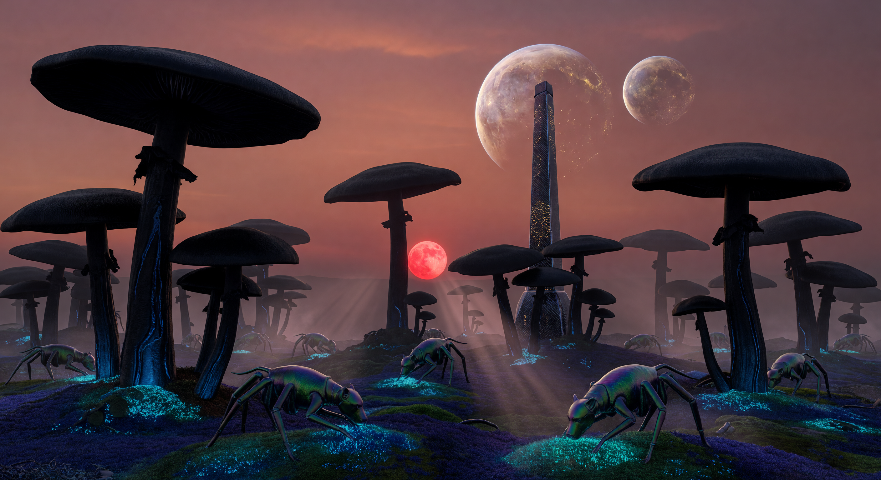 - English: Vantablack Tower-Fungi forest under TRAPPIST-1f crimson light