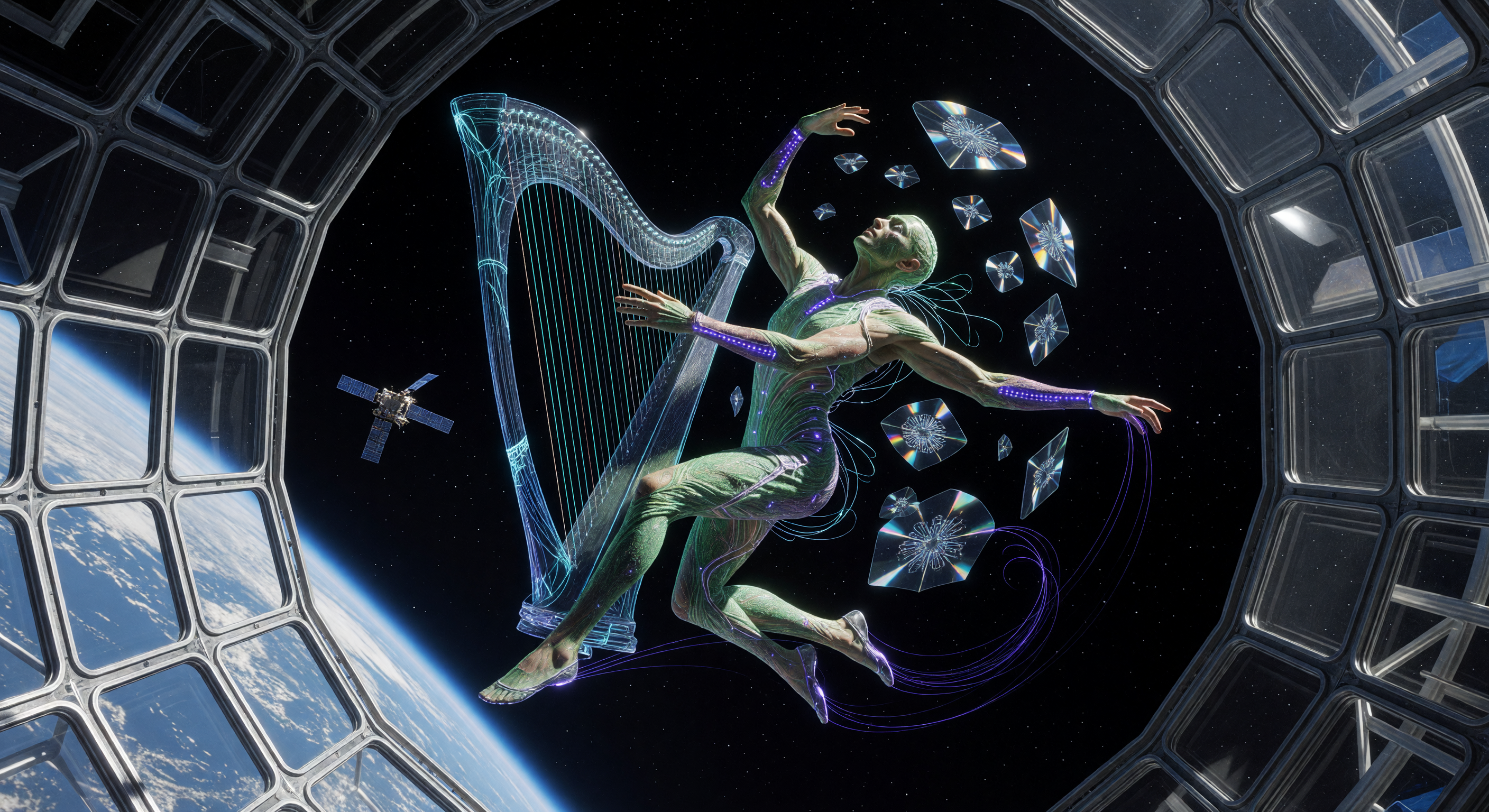 그 이미지는 시각적으로 인상적이며 내적으로 일관된 22세기 궤도 공연 공간의 추측적 묘사로 보입니다. 공연자는 지구가 배경에 보이는 큰 관망 돔이나 열린 구조 프레임 안에서 미세한 중력 상태로 떠 있습니다. 반투명한 홀로그램 하프는 잘 만들어졌고 그럴듯한 미래를 암시합니다. 공연자의 몸은 미세한 증강을 보여줍니다—생물학적 수정이 시사되는 녹색 피부 질감, 지름길 배열과 일관된 사지의 보랏빛 LED와 같은 스트립, 옷과 몸 사이의 경계를 흐리게 하는 흐르는 촉수/케이블. 공연자를 둘러싼 결정체가 떠 있는 물체들은 투영된 예술 작품이나 부유하는 예술 물체를 암시하는 흥미로운 시각적 요소를 추가합니다. 배경에 보이는 위성은 현재 기술에 대해 다소 일반적으로 보이는데(ISS 시대의 디자인과 유사함), 이는 22세기 환경에 대한 경미한 시대적 착오이지만, 이는 작은 불만입니다.