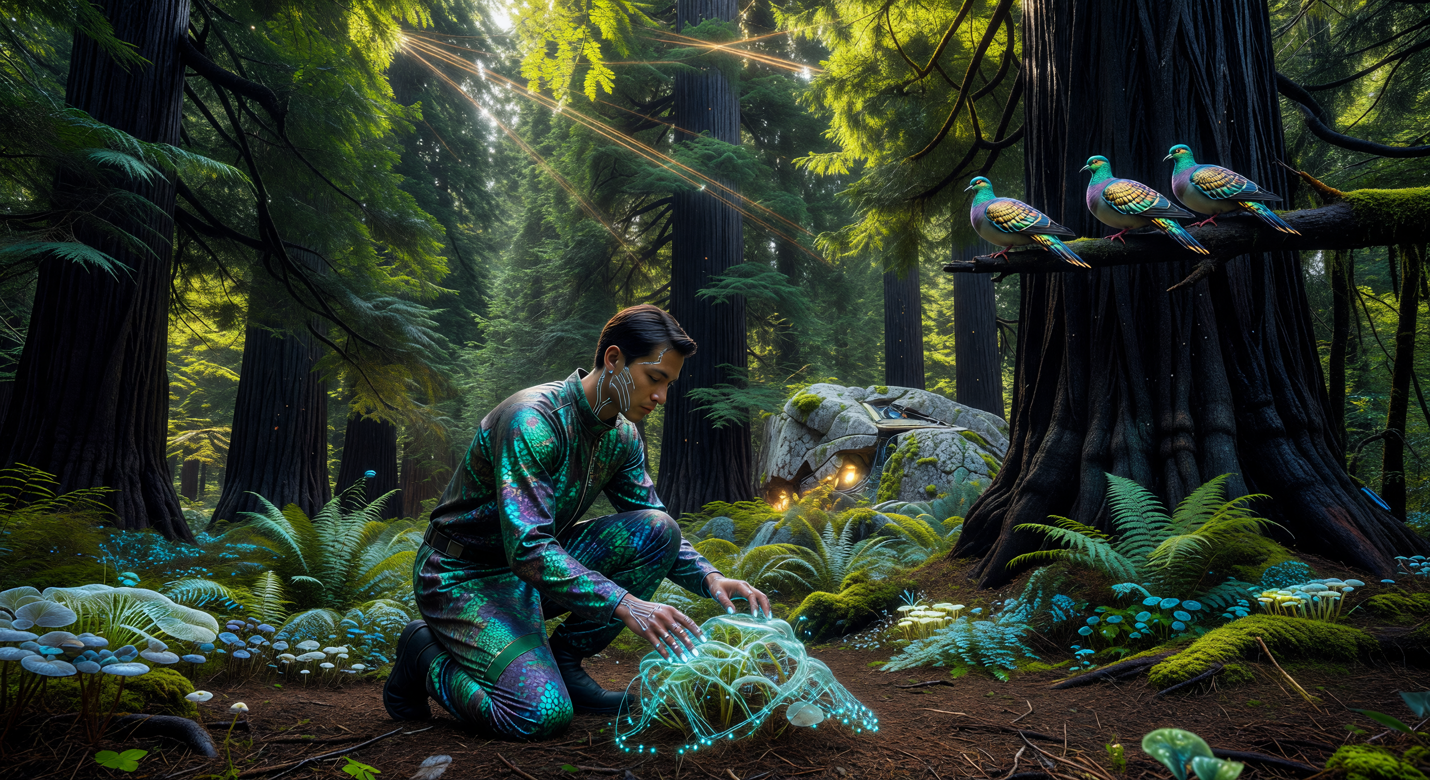 이 이미지는 기술과 자연이 깊이 얽힌 추측적인 미래를 매력적이고 시각적으로 일관되게 묘사하고 있습니다. 무릎을 꿇고 빛나는 균사 네트워크와 상호작용하는 감시자의 모습은 환상적이며 잘 구성되어 있습니다. 세쿼이아 숲의 설정은 풍성하고 설득력이 있으며, 양치식물, 이끼, 생물 발광 곰팡이의 풍부한 저지대가 자연 재야생화와 합성 증강을 암시합니다. 감시자의 얼굴 장식과 무지개 패턴의 정장은 내장된 기술을 암시하며, 촉각 인터페이스 개념과 잘 어울립니다. 나뭇잎을 통해 흐르는 광선은 충분히 타원형 에너지 배열을 나타낼 수 있는 가능성이 있으며, 멋진 손길입니다. 하지만 승객 비둘기로 묘사된 새들은 문제가 있습니다 — 실제 승객 비둘기는 특히 날씬하고 긴 꼬리를 가진 새로, 파란 회색의 위쪽과 붉은 배를 가지고 있었습니다. 여기 보이는 새들은 너무 색이 화려하고 몸집이 크며 별새이거나 심지어 앵무새에 더 많이 닮았습니다 Ectopistes migratorius. 만약 이것이 교육 자원으로 의도된 것이면, 멸종된 종의 형태는 인식 가능해야 한다, 비록 약간 수정되었더라도. 이끼로 덮인 바위와 내장되어 있는 빛나는 장치는 매끄럽게 통합된 모니터링 기술을 암시하는 멋진 디테일입니다.