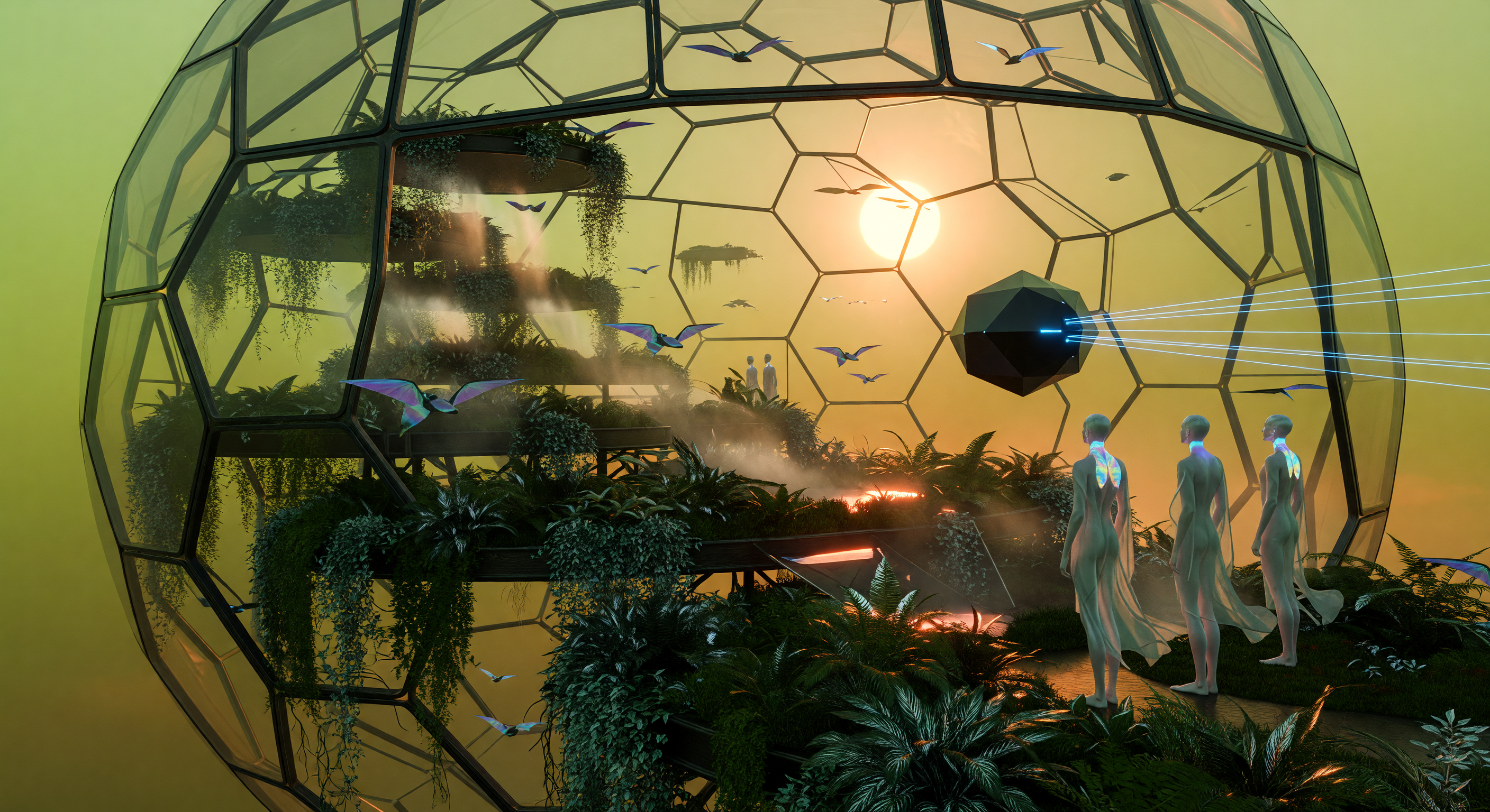 The image is visually compelling and internally coherent as a speculative future habitat. The geodesic sphere structure, lush engineered vegetation (ferns, ivy-like plants), and yellowish-amber atmospheric haze outside are all consistent with the described Venusian cloud-layer setting. The 'Photonics' drone—rendered as a dark geometric polyhedron emitting blue laser-like beams—is a reasonable artistic interpretation, though its communication beams pointing outward into a hazy sky rather than toward any discernible Dyson Swarm infrastructure is visually ambiguous. The transhuman Aeros are depicted as sleek, semi-translucent humanoid figures with a somewhat bioluminescent quality, which reads as a plausible evolved/engineered physiology, though the caption's claims about 'elongated, hollow-bone structures' and 'specialized pulmonary systems' are entirely invisible and unverifiable in the image. The flying creatures with iridescent wings are an interesting addition not mentioned in the caption at all—a minor inconsistency. The sun appears larger and redder than present-day as seen from Venus, which is appropriate for the Solar Expansion era timeframe and is a scientifically sound detail worth acknowledging positively.