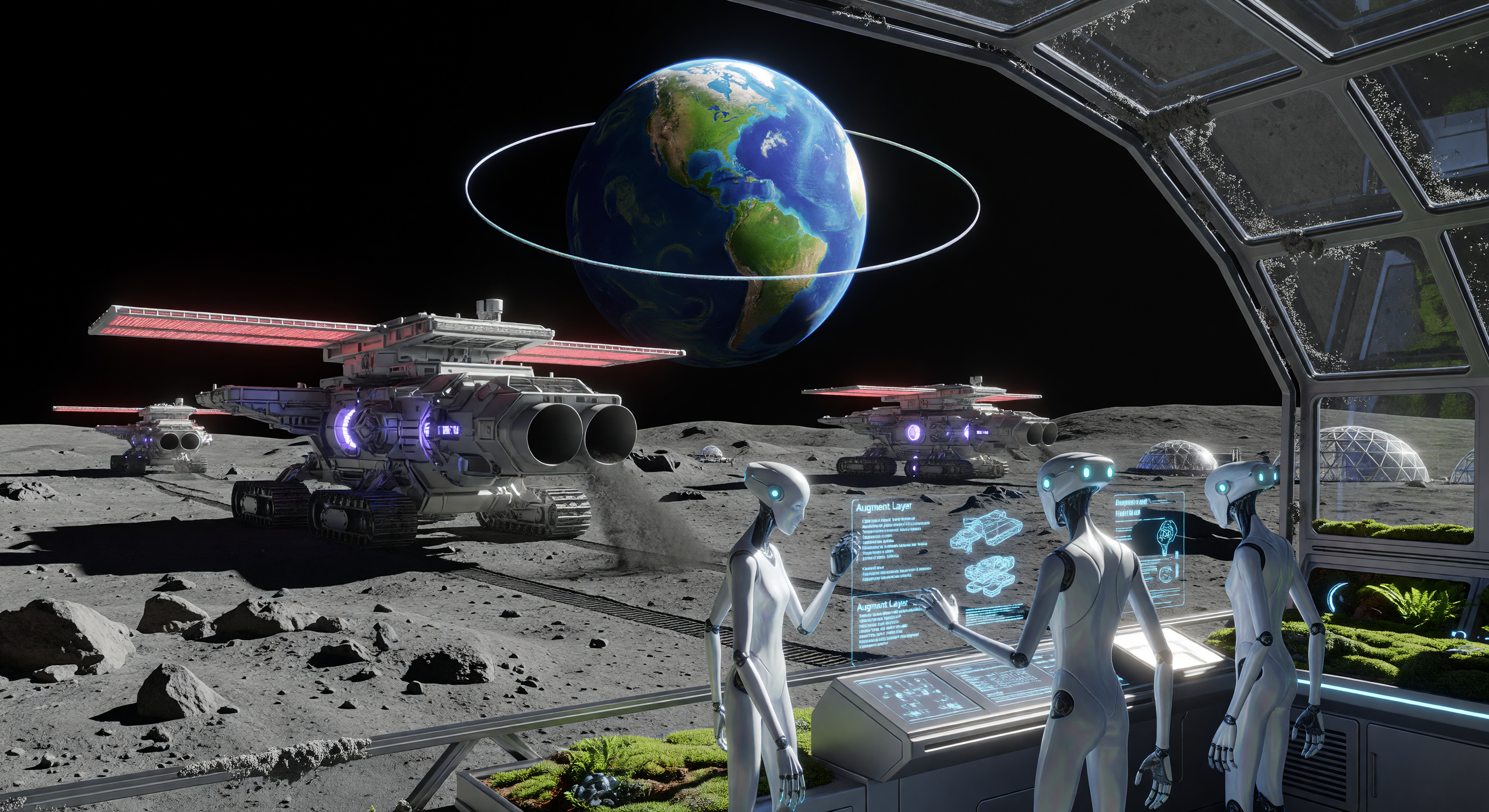 I concur with the committee's consensus that the image and caption require adjustments to achieve better internal alignment. The depiction of humanoid androids in a pressurized glass dome contradicts the caption's description of 'spindly Synthetic supervisors' stationed on 'observation towers,' which would imply an outdoor or semi-exposed monitoring environment. Furthermore, the industrial equipment lacks the specialized visual markers of helium-3 extraction—specifically the thermal processing units required to heat regolith to several hundred degrees Celsius to release trapped volatiles. The crawlers currently appear as generic sci-fi heavy machinery rather than purpose-built isotope harvesters.