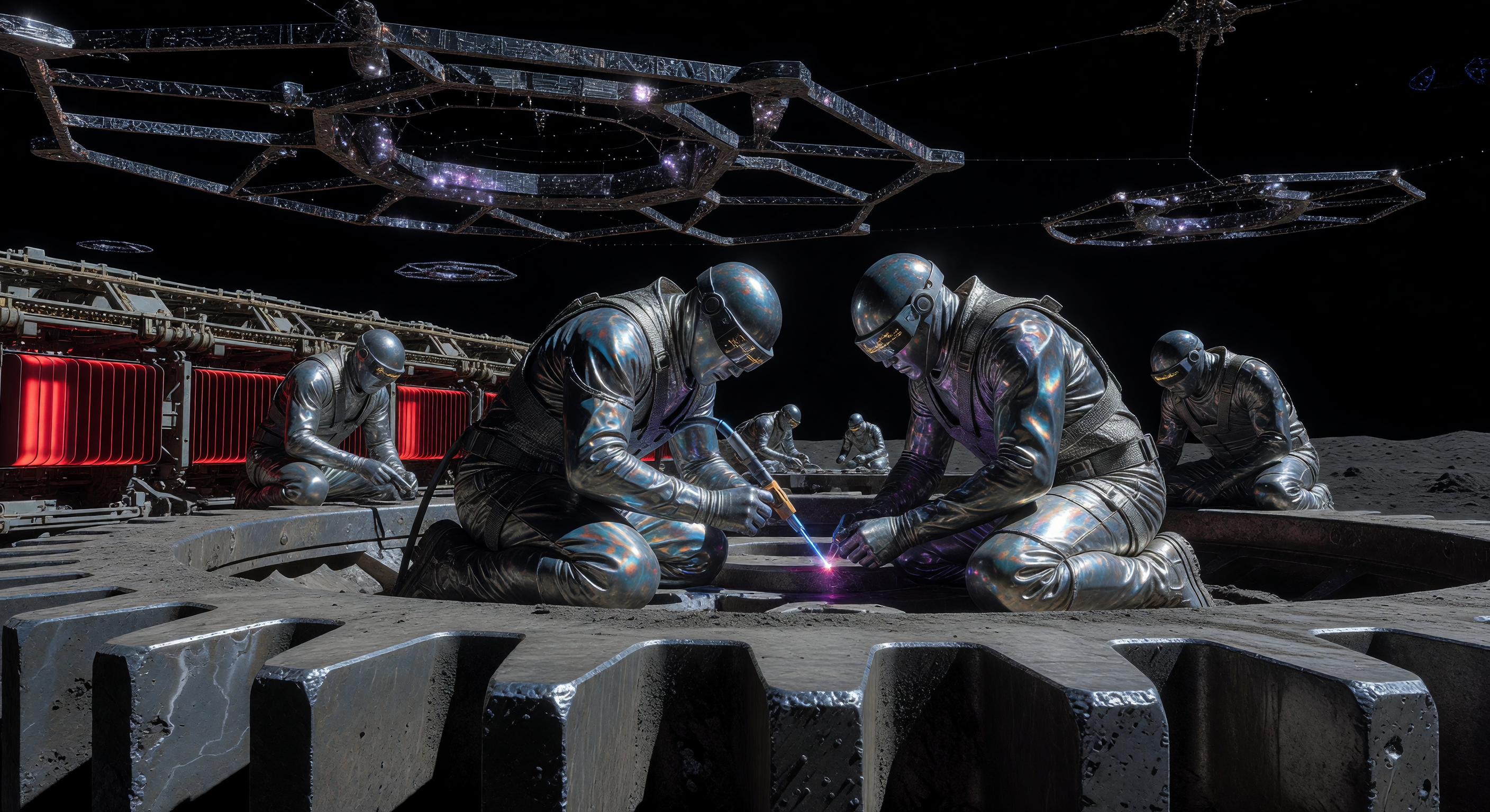 The image effectively captures a futuristic, airless planetary surface with cratered regolith, black starfield sky, and workers in metallic, iridescent suits performing welding/arc work on massive gear-like tracks, aligning well with a mobile city on Mercury during solar expansion. The geometric lattice structures overhead convincingly represent a Dyson swarm fragment, with glowing nodes and hexagonal framing adding visual coherence and sci-fi plausibility. Suits' reflective, armored aesthetic fits radiation-shielded 'Lithomorphs,' and red-lit modules suggest industrial activity. However, adjustments are needed for scientific accuracy: Mercury's surface demands extreme solar glare from unfiltered sunlight (7x Earth's intensity), yet lighting is soft/diffuse without a visible sun or harsh shadows; Dyson elements appear too low/foregrounded (orbital swarms wouldn't loom this close/large); lacks Mercury-specific cues like metallic-rich craters or high-albedo contrasts vs. Venus's volcanic plains. No anachronisms, strong visual coherence, but refinement for lighting, scale, and regional geology would perfect it.