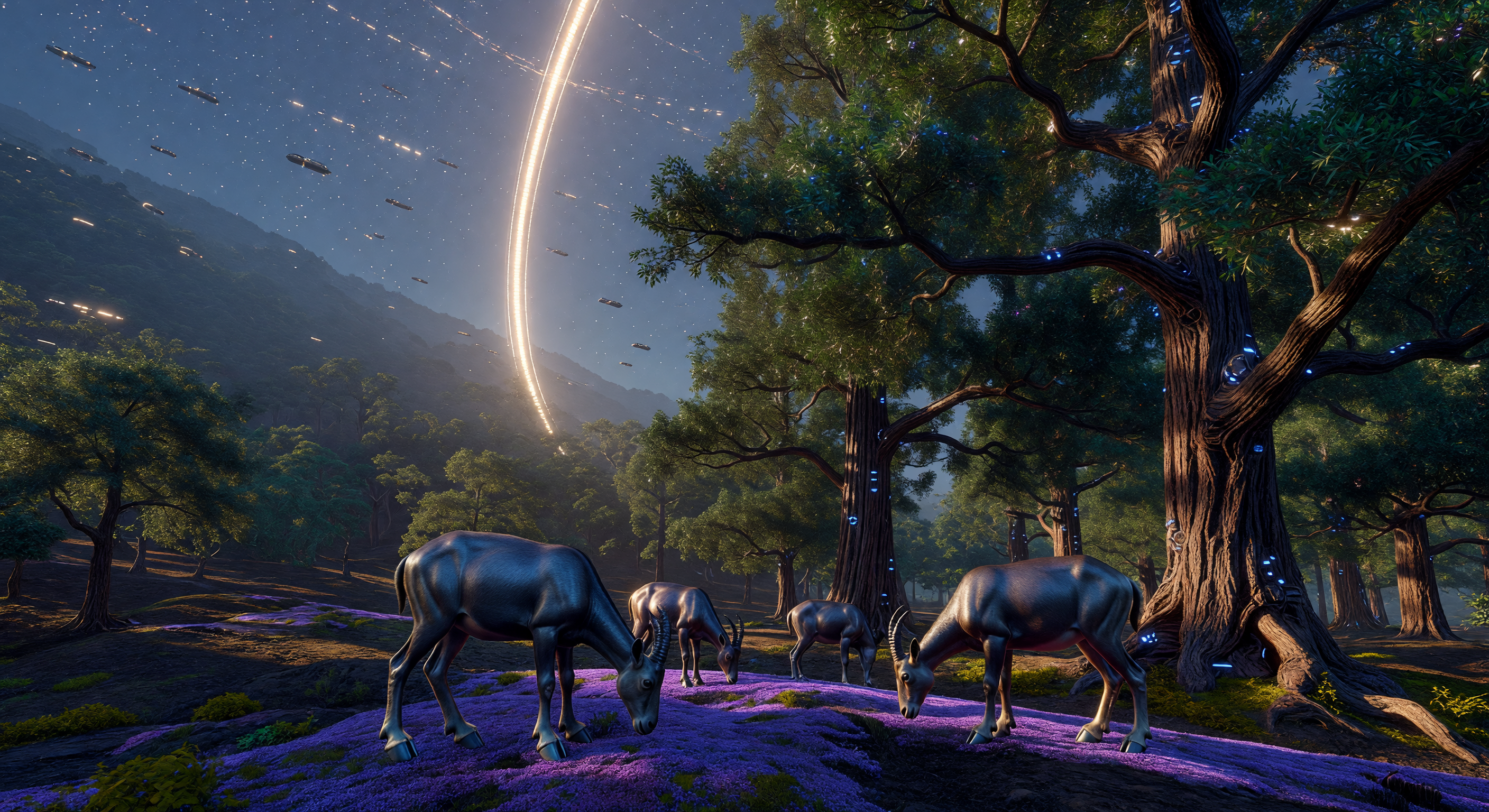 The image effectively captures a speculative future ecosystem inside a rotating generation ship, with large oak-like trees featuring subtle blue glowing nodes (plausibly indicating nanotube reinforcement or bioluminescence), metallic-sheen ibex-like ungulates with curved horns and sturdy builds grazing on vibrant purple ground cover, and a curved overhead arc light with starry/ship elements suggesting the habitat's interior curvature and artificial lighting. The rocky terrain and forested grove convey a self-contained 'Heavy-Wood Grove' under centrifugal gravity, with strong visual coherence and no glaring anachronisms for a late 3rd millennium 'Solar Expansion' context. Scientifically, the scene is plausible for advanced bioengineering, though the animals lean more bovine than strictly ibex (slimmer legs, bulkier bodies), and the purple flora appears more like flowering plants than moss—minor mismatches warranting prompt tweaks for precision, but not a full regenerate.