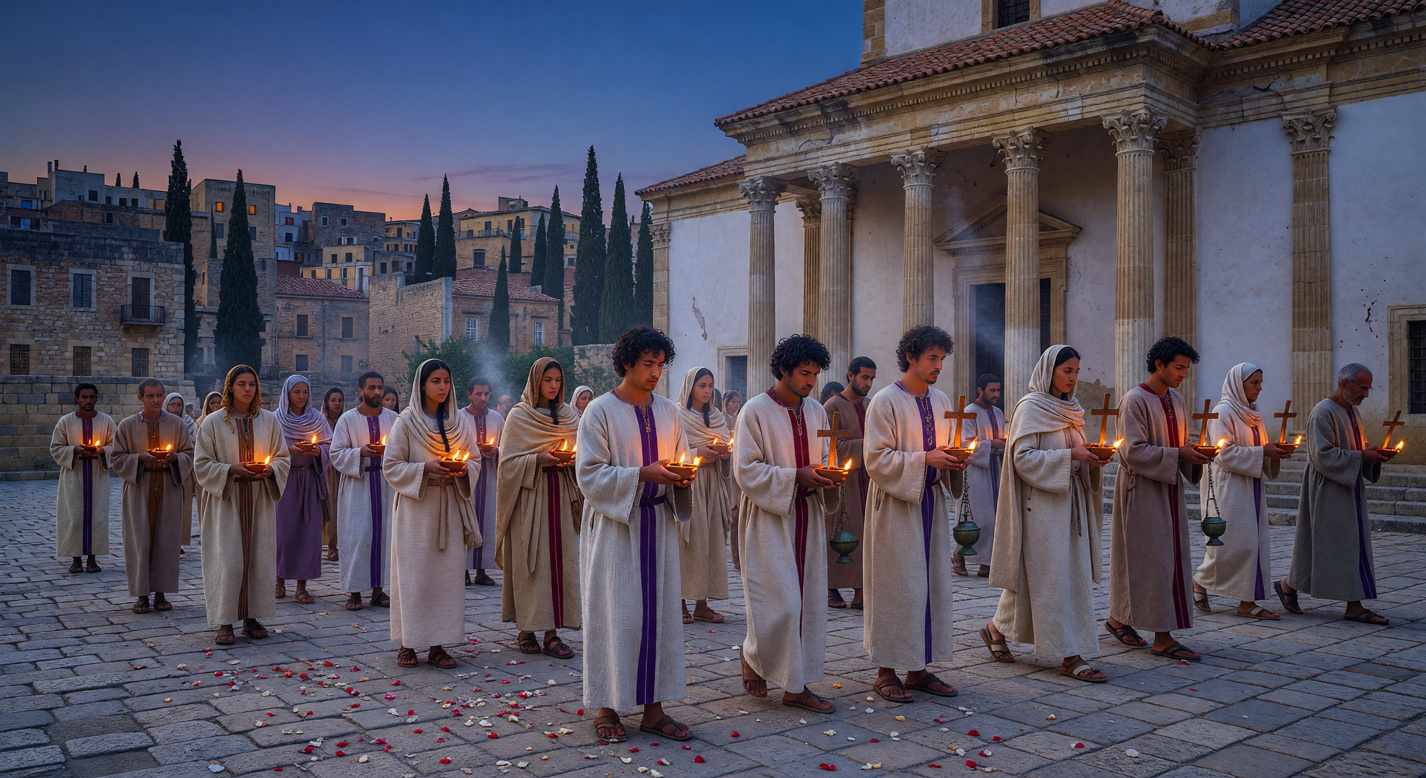 The image effectively captures a plausible Late Antique Christian procession at dusk in a North African urban setting, with stone-paved courtyards, colonnaded basilica architecture (whitewashed walls and red-tiled roof align with archaeological remains of sites like the Basilica Maiorum in Carthage), cypress trees typical of Mediterranean landscapes, and a diverse group in woolen tunics and cloaks with vertical purple clavi (decorative stripes authentic to Roman-influenced Late Antique dress across classes and ethnicities). Lighting from handheld oil lamps or candles is visually coherent, evoking religious fervor, and the solemn procession with incense smoke adds atmospheric plausibility. Minor issues include slightly oversized or prominent processional crosses that lean toward later medieval iconography rather than subtler 5th-century North African crosses (e.g., chi-rho symbols), generic lamp shapes that don't distinctly match African Red Slip ware ceramics (more bowl-like or wheel-made forms), and scattered rose petals on the ground, which are anachronistic as roses were not native or commonly strewn in North African rituals then—adjustable via prompt refinements for subtler symbols like palm fronds. No major anachronisms in architecture, clothing, or geology; culturally coherent for Punic-Roman-Berber Carthage.