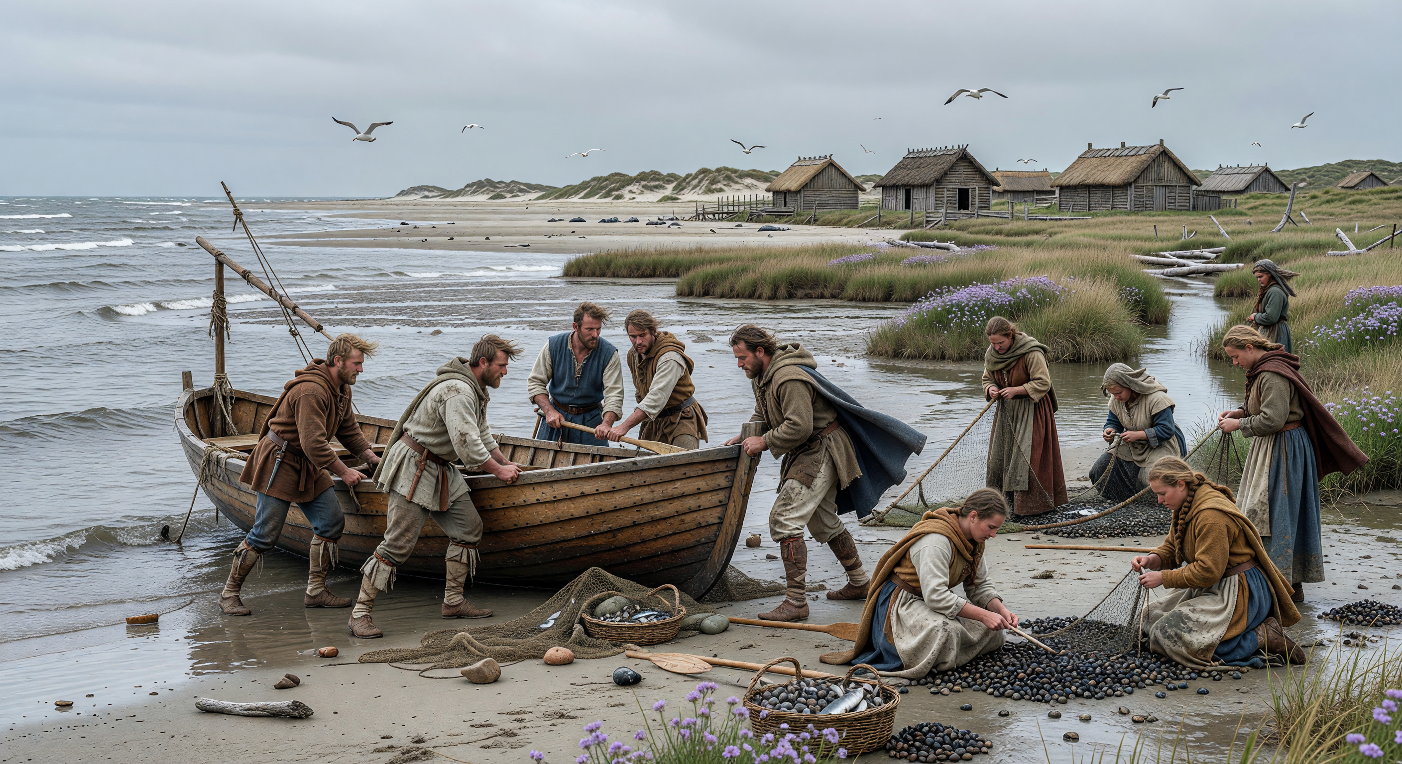 On a windswept 5th-century North Sea shore, fishers haul a clinker-built boat onto wet sand while nearby women and children gather shellfish and repair nets among the tidal flats. Their woolen tunics, cloaks, dresses, and simple leather shoes reflect the practical clothing of coastal communities in Frisia or Saxon territory at the end of Roman antiquity. The scene evokes a maritime world shaped by estuaries, salt marshes, and small-scale exchange, where fishing, shellfish gathering, and boat handling sustained everyday life along Europe’s northern edge.