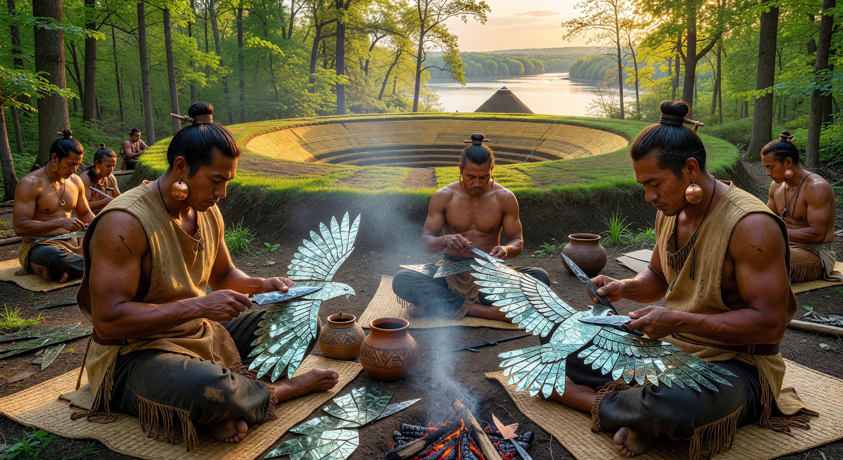 Hopewellian artisans in the Ohio River Valley meticulously craft intricate ceremonial objects from shimmering sheets of mica, using precision-flaked flint tools to shape sacred raptor motifs. In the background, a massive geometric earthwork enclosure rises from the landscape, showcasing the sophisticated engineering and communal coordination of this influential Middle Woodland culture. These craftsmen, adorned with polished copper earspools, represent a society connected by vast trade networks that imported exotic materials from across North America to create their highly symbolic funerary and ritual art.