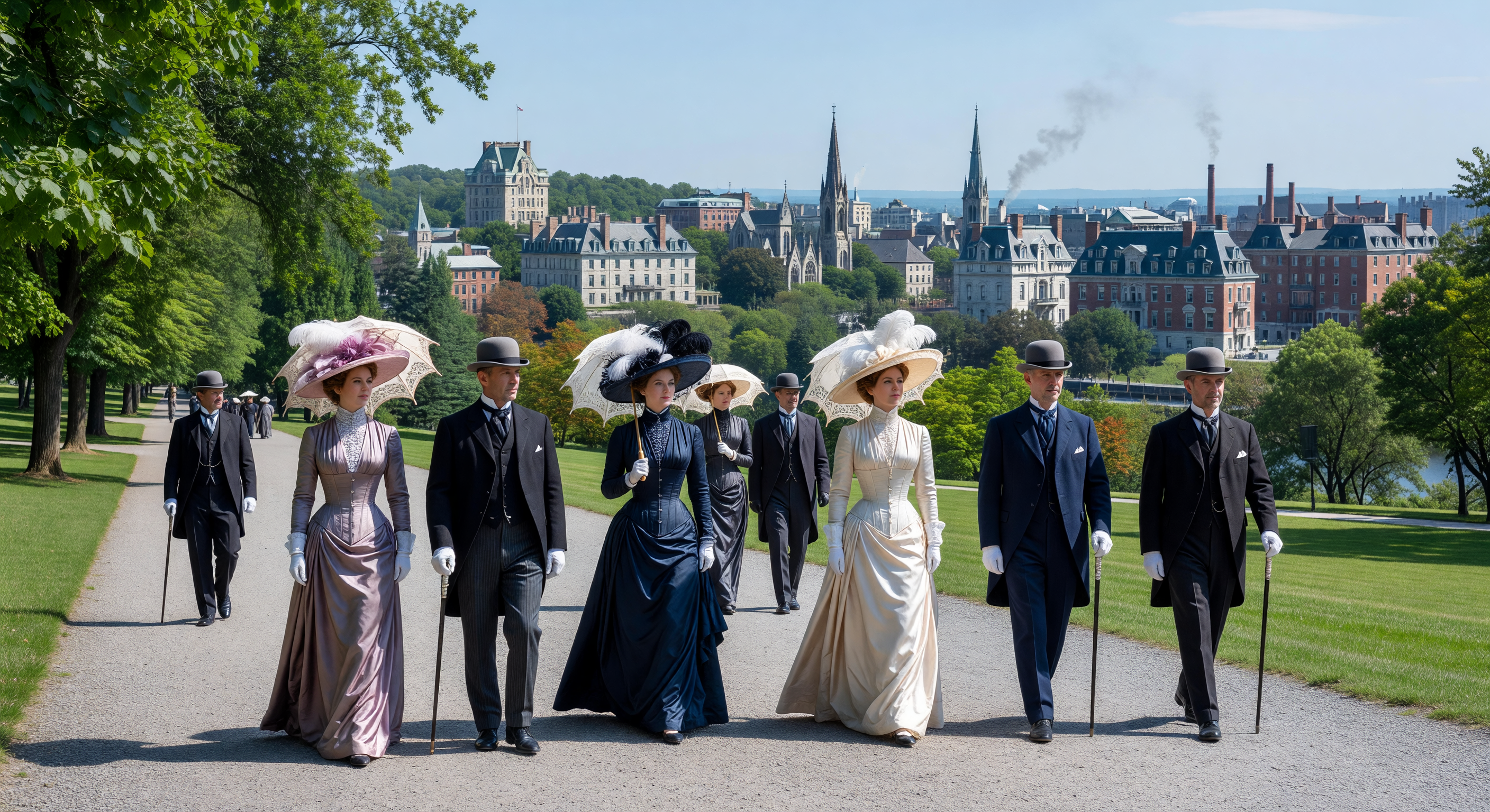 De afbeelding vangt effectief de essentie van een zondagse Belle Époque-promenade in Mount Royal Park, met verzorgd aangelegde grindpaden, volgroeide loofbomen die geschikt zijn voor Zuid-Quebec, en een verre stadssilhouet met kerktorens, grijze kalkstenen structuren vermengd met enig rood baksteenwerk en industriële schoorstenen—allemaal plausibel voor Montreal rond 190-191. De kleding is grotendeels accuraat: damesjurken van zijde met hoge kragen, gecorseerde tailles die de S-lijnsilhouet benaderen (naar voren gestuwde buste en holle rug), grote gevederde hoeden en parasols; heren dragen driedelige wollen pakken, bolhoeden, handschoenen en wandelstokken, geheel in overeenstemming met de Edwardiaanse elite-mode. Het landschap weerspiegelt Olmsteds naturalistische ontwerp met slingerende paden en vergezichten, en er zijn geen grote anachronismen aanwezig, zoals moderne voertuigen of naoorlogse architectuur. De visuele samenhang is sterk en roept een verfijnde stedelijke ontsnapping op.
