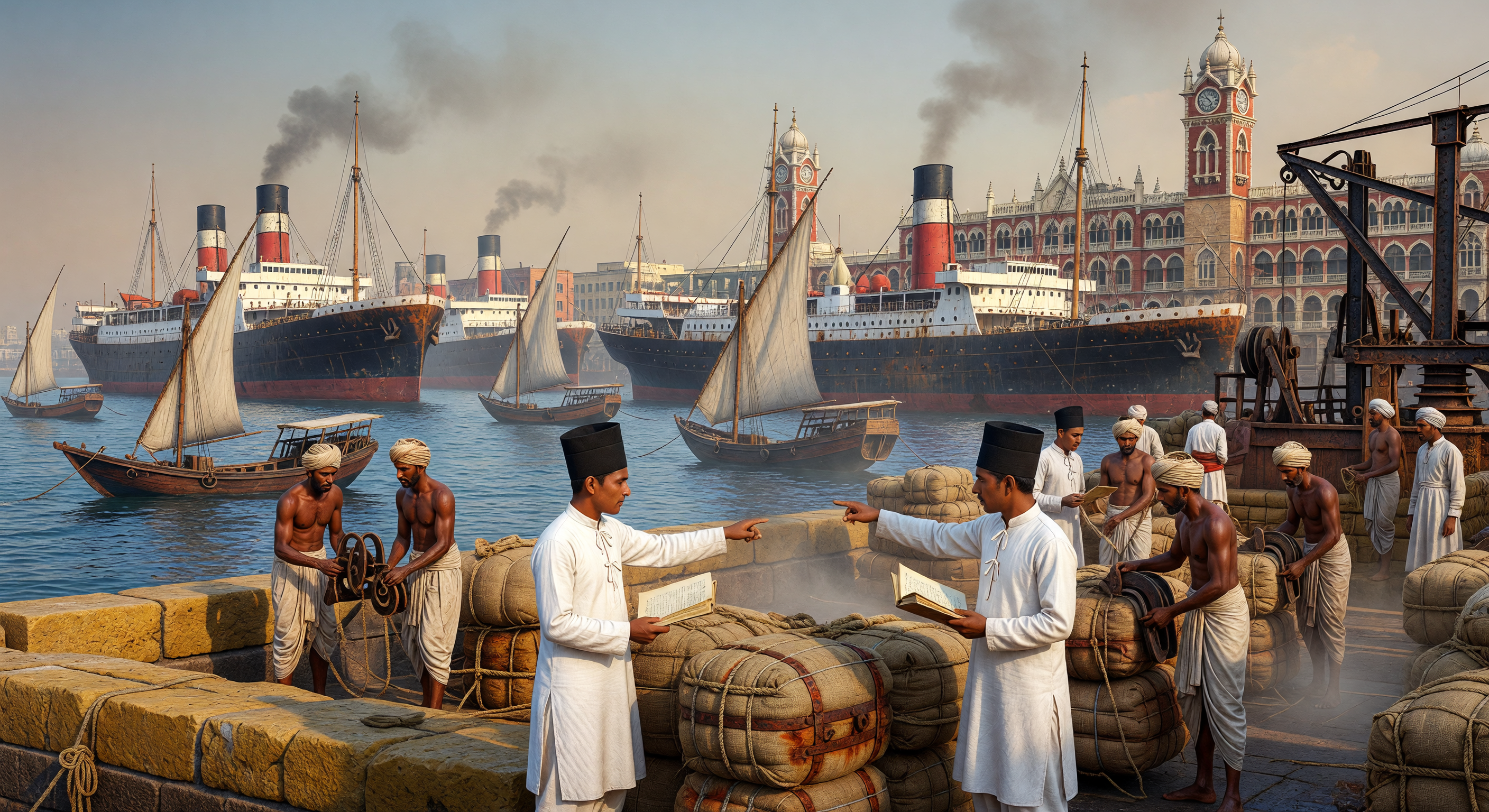 De haven van Bombay bruist van activiteit in de jaren 1890, waar traditionele houten dhows met hun karakteristieke zeilen zij aan zij liggen met de imposante, rokende stoomschepen van de Britse vloot. Op de kades van geel basalt houden Parsi-kooplieden in witte gewaden en hoge zwarte hoeden nauwlettend toezicht op de overslag van balen katoen, die door gespierde arbeiders met takels worden verplaatst. Dit tafereel illustreert de status van Bombay als cruciaal knooppunt in de wereldhandel tijdens de 'High Raj', omlijst door de opkomende Indo-Saracenische architectuur die de versmelting van Victoriaanse industrialisatie en lokale commerciële expertise symboliseert.