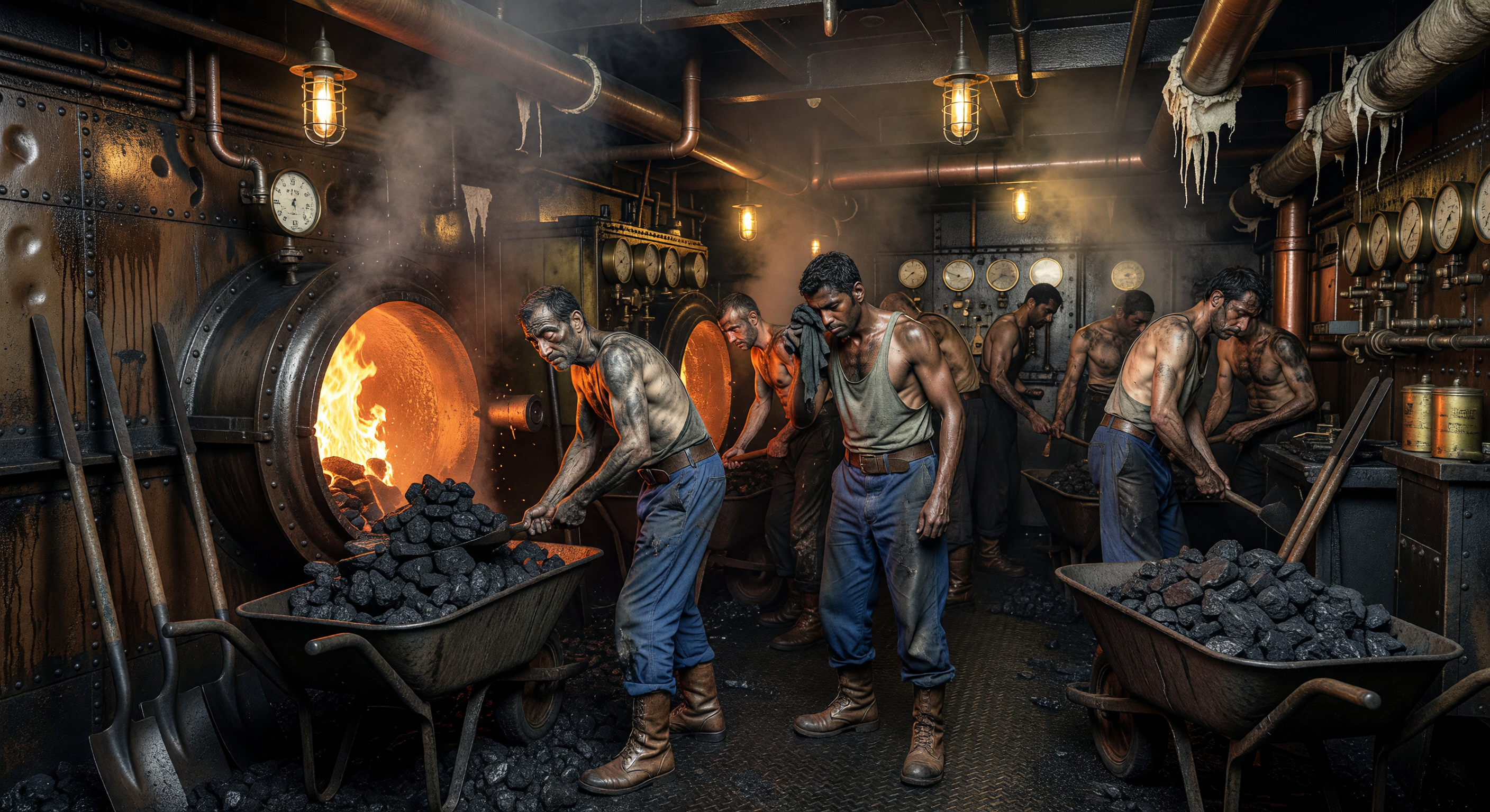 In de verstikkende hitte diep in de romp van een Belle Époque-oceaanstomer werpt de felle gloed van de ovens een dramatisch licht op de "Black Gang", een internationale bemanning van stokers bedolven onder antracietstof en zweet. Terwijl de bovenliggende dekken fungeerden als drijvende paleizen van luxe, vormde dit claustrofobische rijk van geklonken staal en sissende stoom de brute industriële motor achter de mondiale migratiestromen rond 1900. Hier verrichtten mannen van diverse achtergronden, van Ierse arbeiders tot Zuid-Aziatische "Lascars", uitputtende fysieke arbeid in temperaturen boven de 50 graden om de massieve ketels dag en nacht brandende te houden.